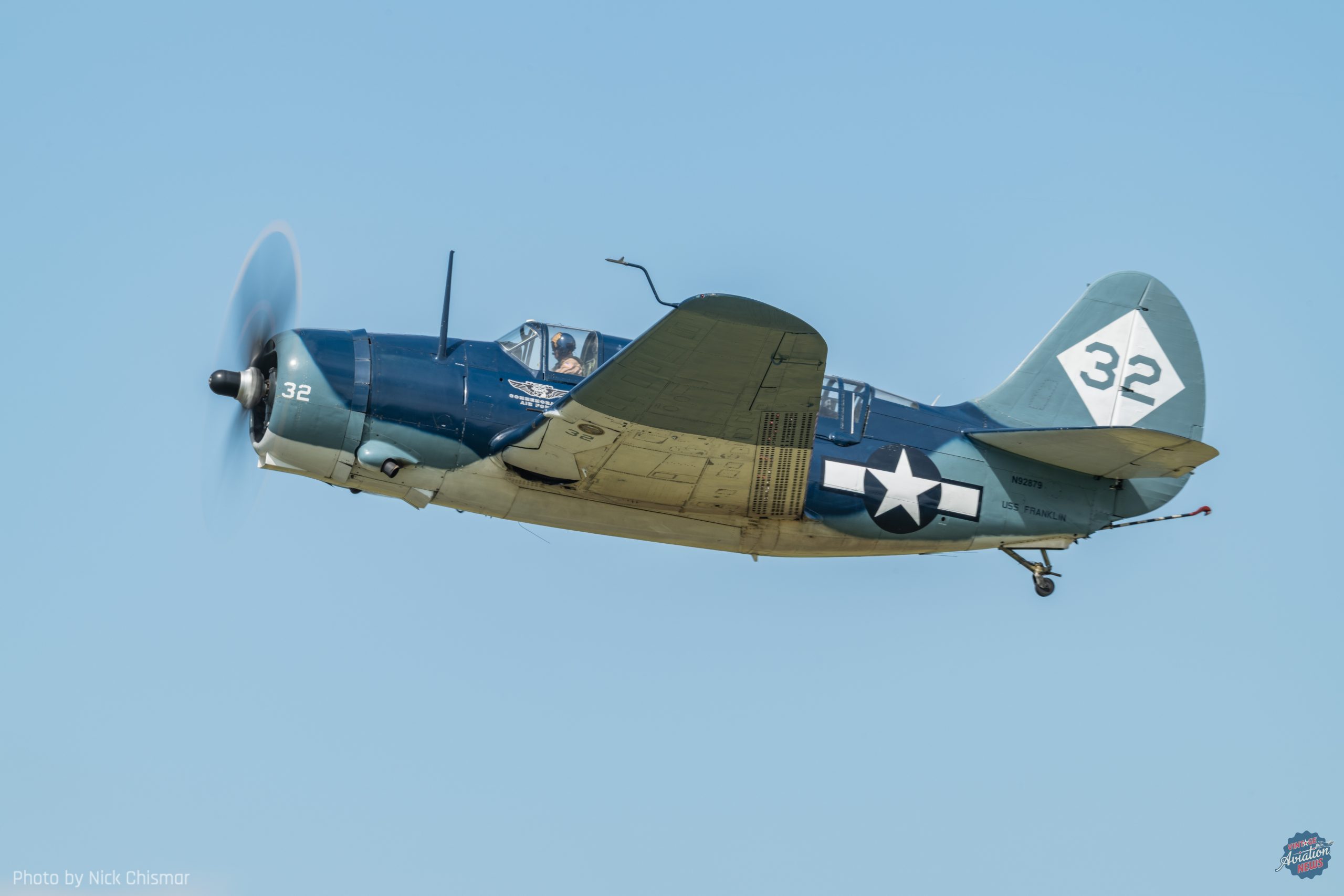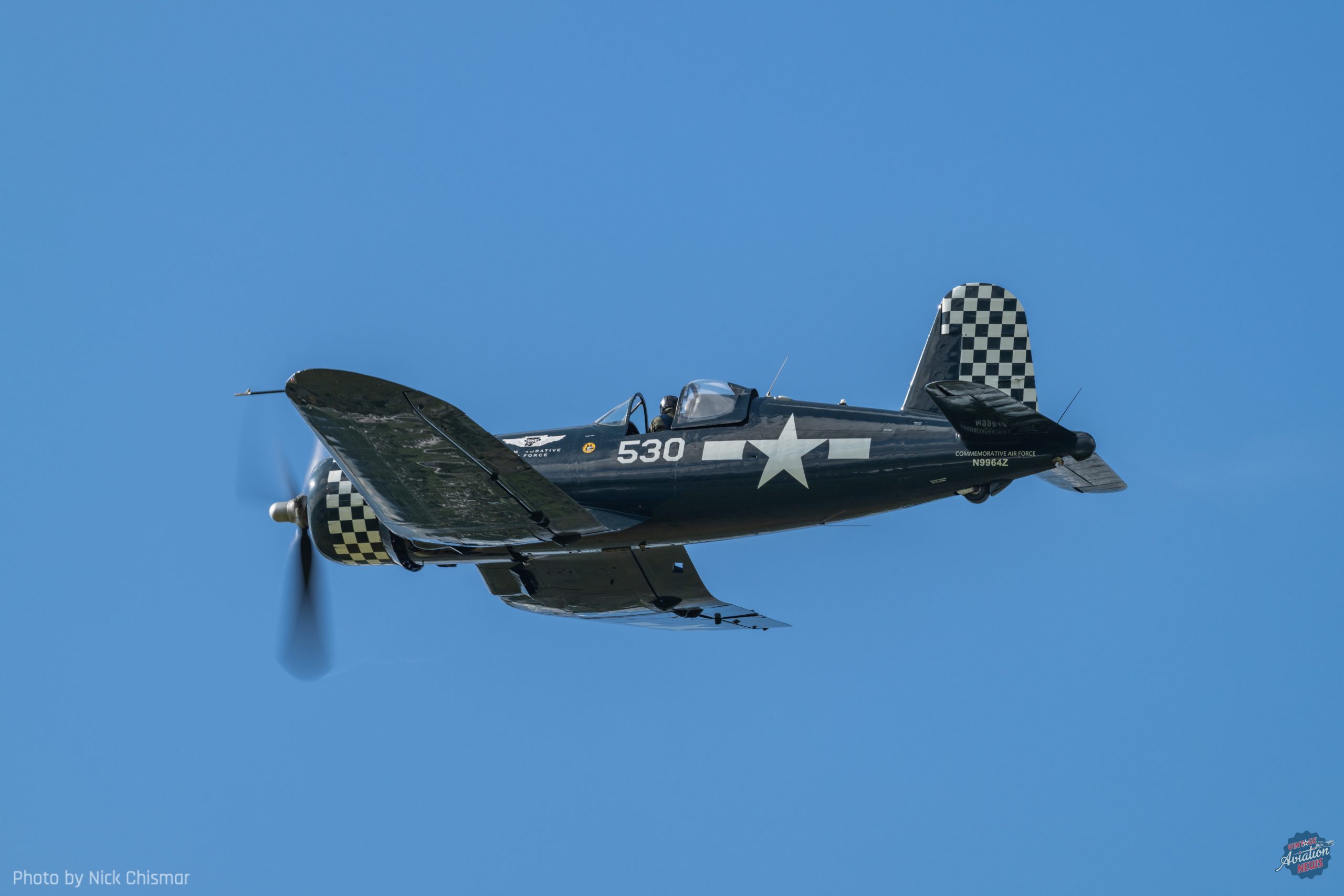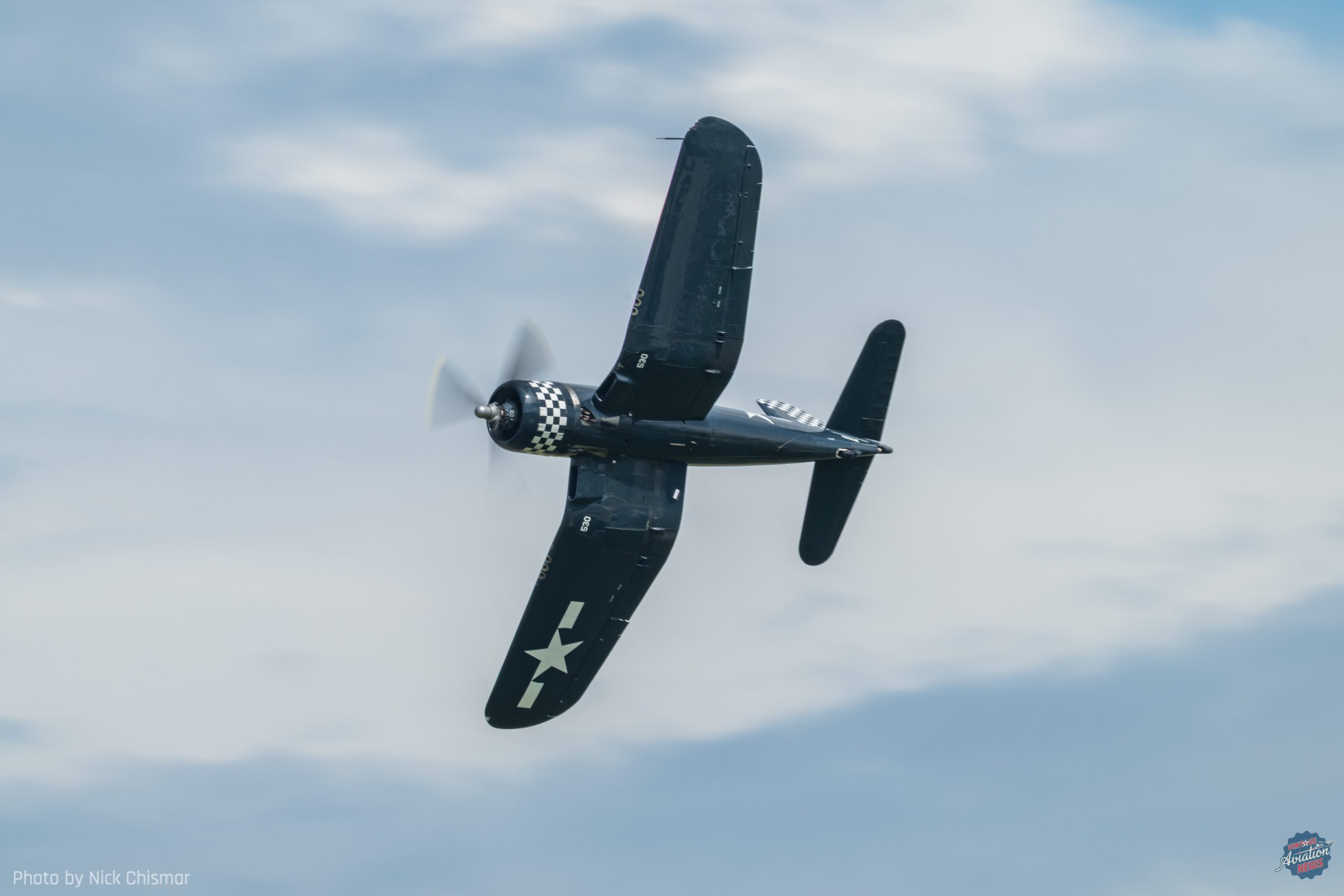 The Skyraider, Zero (a modified T-6), Wildcat, Helldiver, and Corsair launched and made sweeping passes over the airfield. After a few rounds, the Corsair broke formation and returned for a solo display. Piloted by Mark Todd, the gull-winged fighter screamed over the field with vapor trails curling off its wingtips. The iconic whistle of its supercharger echoed over the photo pit.