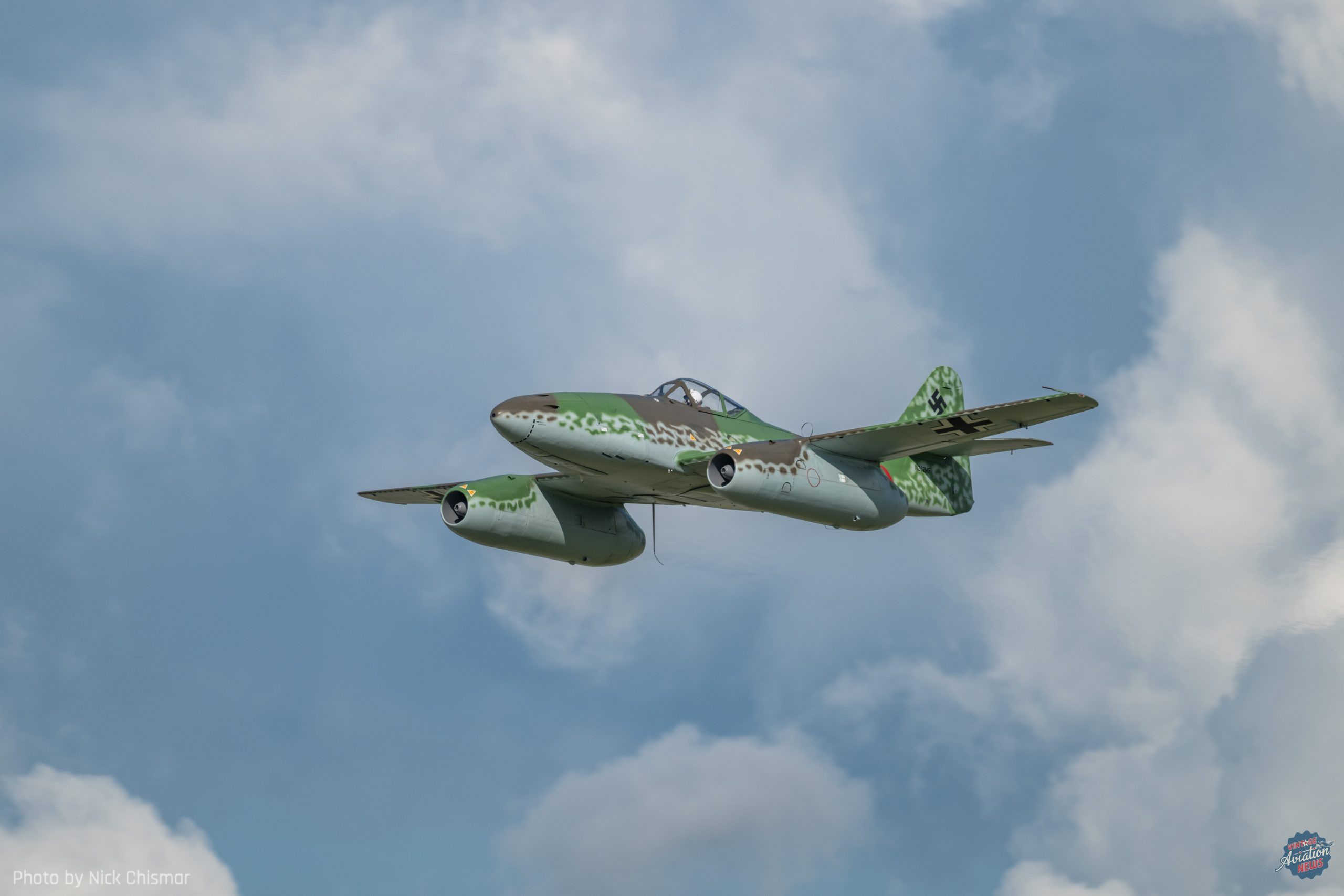 But just around the corner, two aircraft in particular captured the spotlight. Parked near the museum’s legendary P-61 Black Widow were Warren Pietsch’s gleaming P-51C Thunderbird and the Military Aviation Museum’s Me 262—the first time a jet fighter had ever taken part in this event. The crowd was mesmerized, some drawn to Thunderbird‘s deep blue mirror-like finish, others eager to see the Luftwaffe’s iconic jet fighter up close.