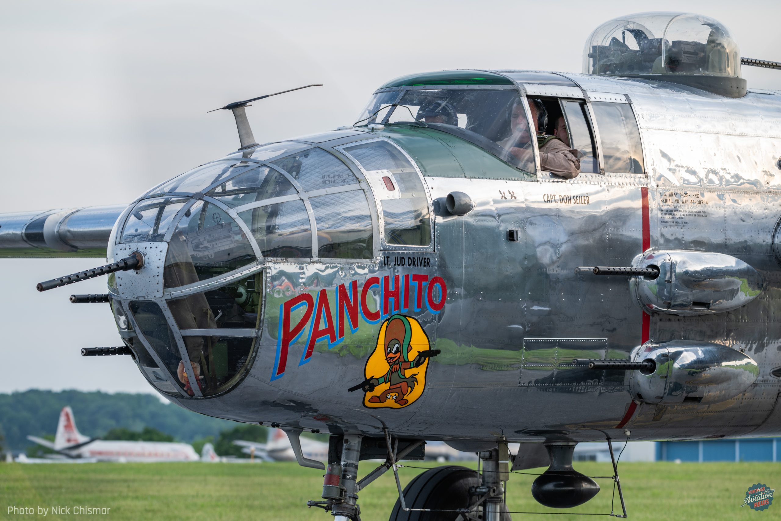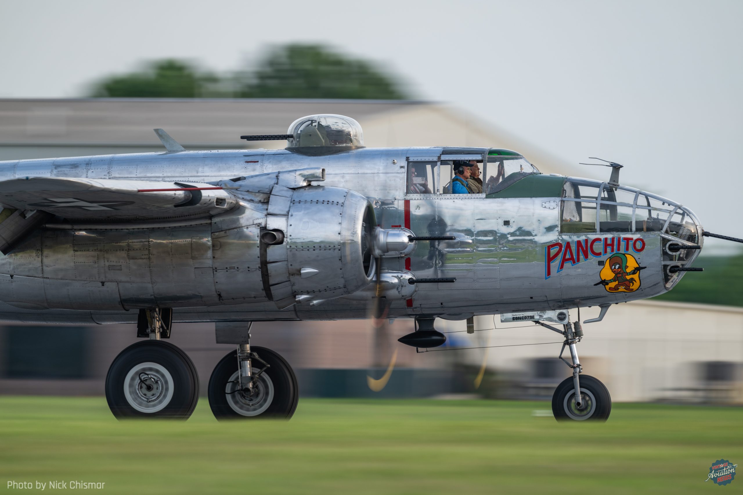 While the airshow portion had yet to begin, ride flights were already in full swing. Spectators gathered at midfield to watch CAF Airbase Georgia’s P-51D and T-6 Texan roar into the sky. Across the airport, the Delaware Aviation Museum’s B-25J Panchito raced past the photo pit, drawing long camera lenses. Then came the unmistakable rumble of a B-29 Superfortress: Doc took off for a ride flight, marking its first appearance at WWII Weekend since 2018—filling in for regular participant Fifi, currently grounded awaiting new engines. Another welcome return was the CAF West Texas Wing’s SB2C Helldiver, also making its first appearance since 2018.