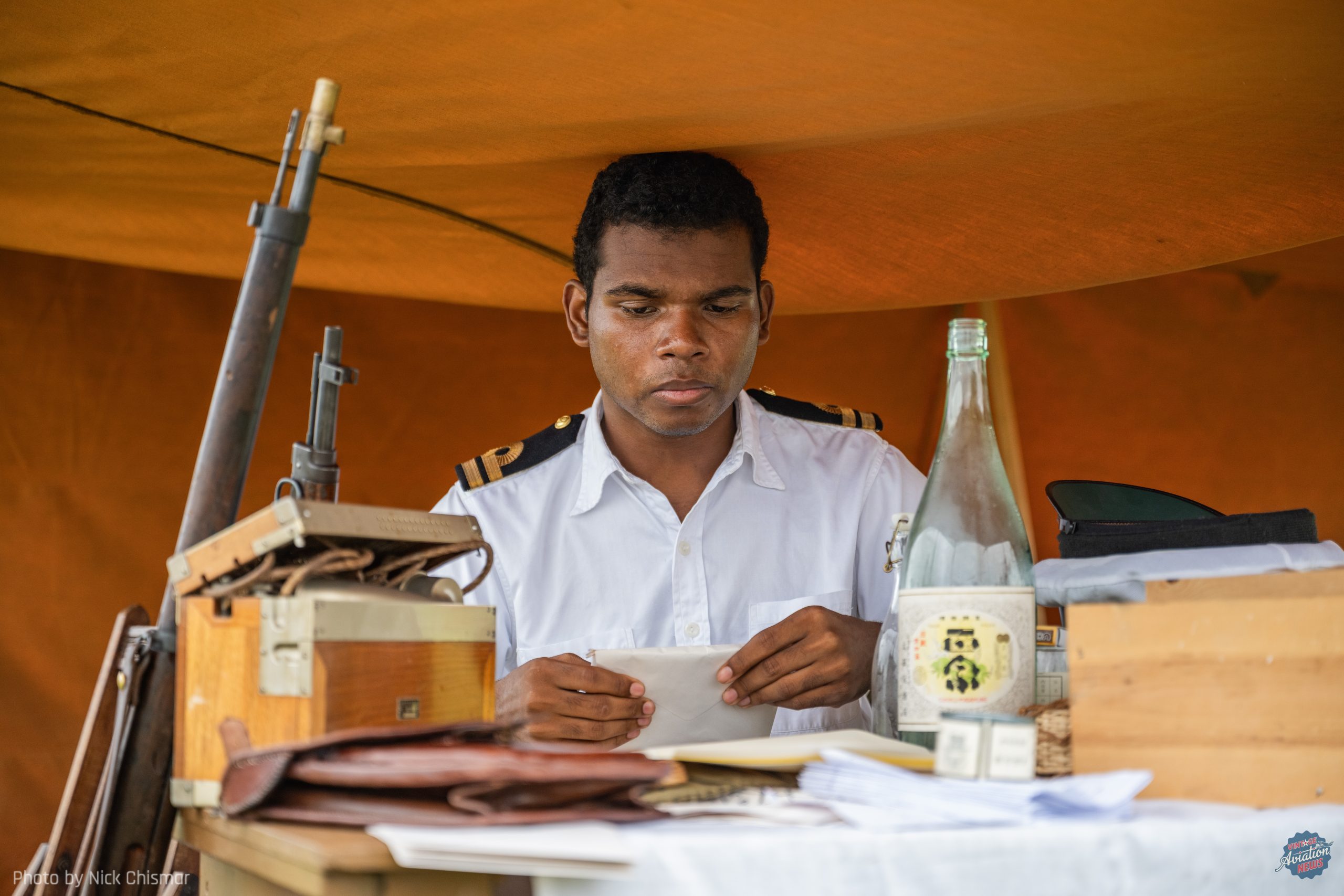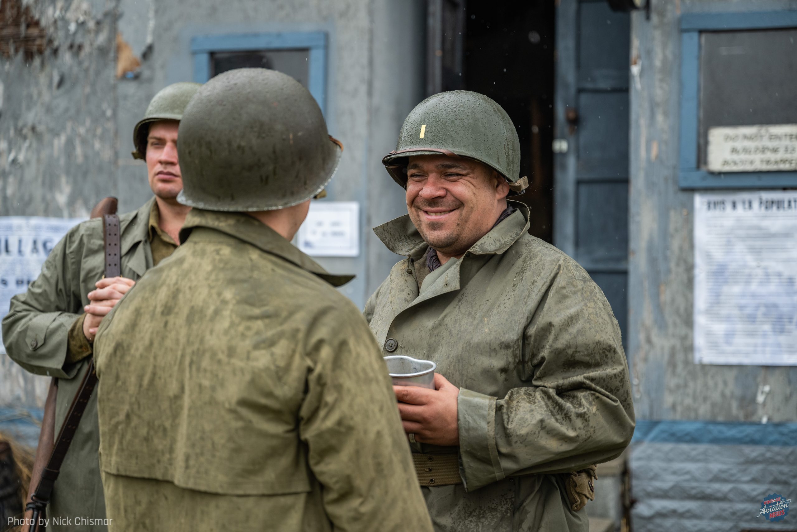 Fortunately, the skies cleared just in time for the evening activities. Reenactors, guests, and big-band tunes filled the main hangar for the first dance, while ride flights resumed. The break in the weather also allowed the first portion of the WWII Weekend Photo Experience to take place—a golden-hour walk along the flight line. Photographers made their way down the ramp, capturing moody sunset shots of the Skyraider, Airbase Georgia’s FG-1D Corsair, and the Helldiver. But the highlight was Doc, silhouetted against the setting sun. Before the night was through, an impromptu airshow broke out as an Air National Guard C-130 performed touch-and-go landings.