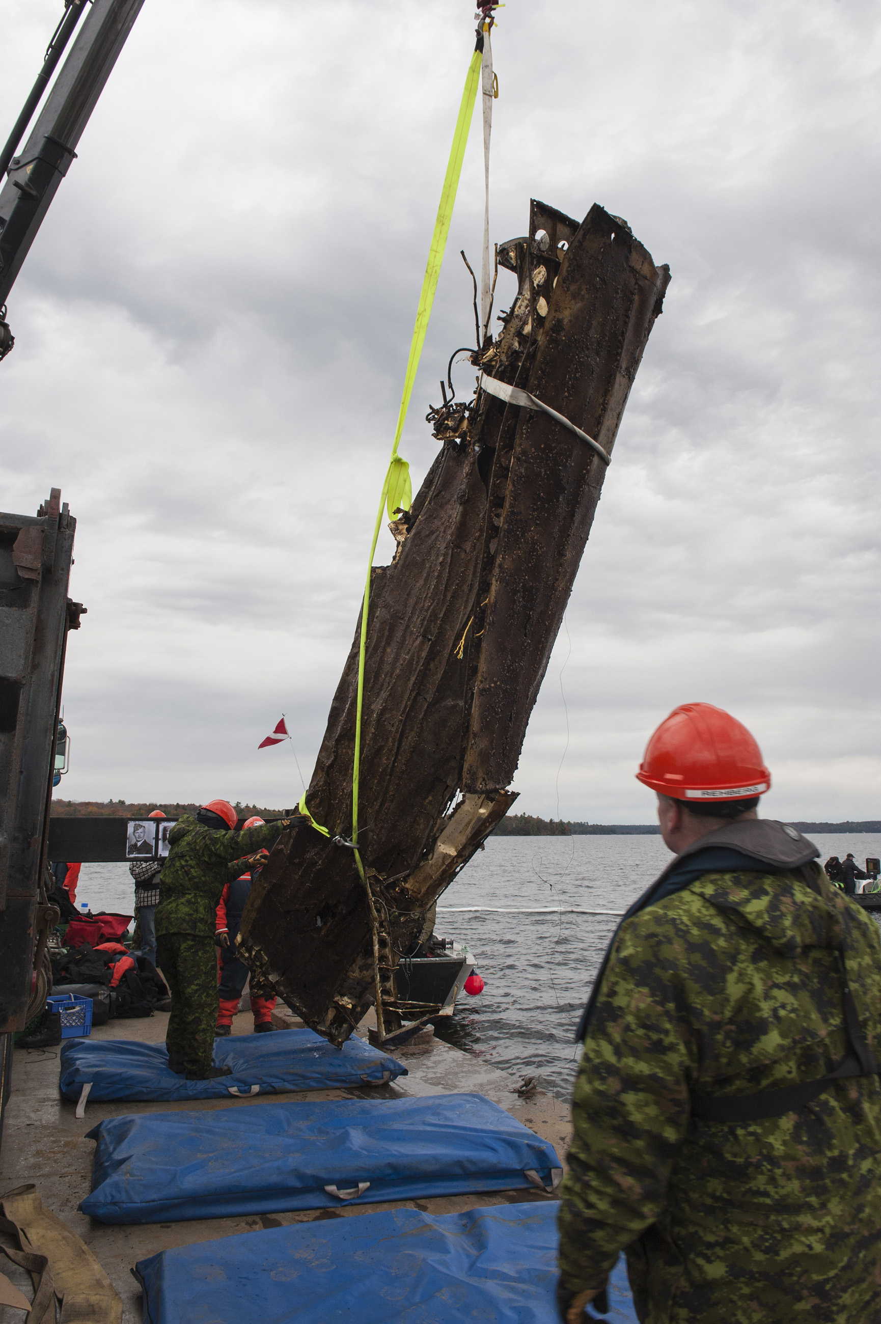 Given the rarity of the aircraft, and that it was relatively intact, albeit in five large pieces, many of us hoped that the Canadian authorities would agree to recover the wreck. Today has seen the beginning of the recovery process as the first major sections rose up from the lake, including the rear fuselage and tail, a wing, undercarriage, and even an additional .303 machine gun. The recovery crew expects the rest of the aircraft to come up over the next nine or ten days. The aircraft will then go to the National Air Force Museum of Canada in Trenton, Ontario where it will likely receive a full restoration in the coming years to serve testament to her two fallen pilots, and all the others who gave their lives in the name of freedom for Canada.