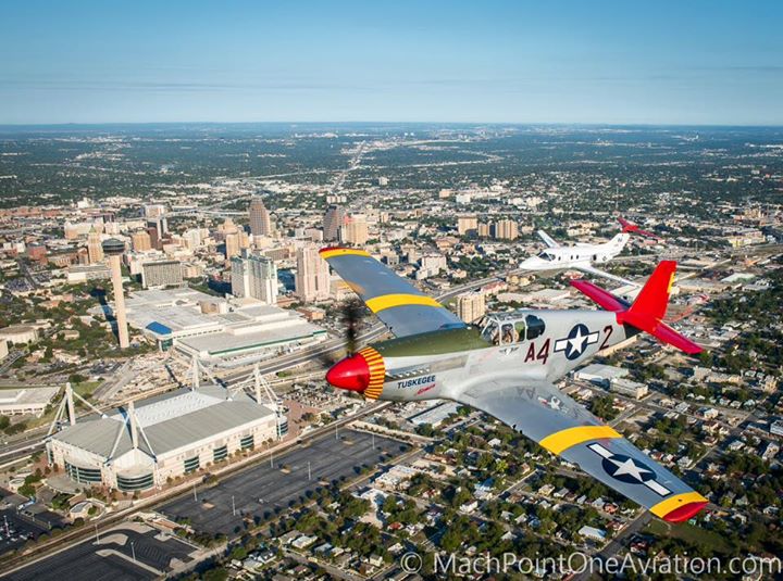 PRESS RELEASE –Minneapolis, Minn. – November 4, 2015 – The Commemorative Air Force (CAF) Red Tail Squadron, America’s tribute to the Tuskegee Airmen, attended Joint Base San Antonio (JBSA) Air Show and Open House to participate in a flyover of the city to pay tribute to the Tuskegee Airmen, America’s first black military pilots and their support personnel. On October 29, spectators were treated to a flyover formation with a red tailed P-51C Mustang and a red tailed T-1A Jayhawk.The 99th Flying Training Squadron (FTS), currently stationed at JBSA – Randolph, traces its origins back to World War II when it was constituted as the 99th Pursuit Squadron on March 19, 1941. Assigned to the U.S. Army Air Corps, it was the first African American flying unit and the first to enter combat. Today, the 99th FTS operates their T-1A Jayhawk painted with a red tail in homage both to their historic origins and to the P-51 Mustang, the signature aircraft of the Tuskegee Airmen in WWII. The Jayhawk is used in advanced training for students identified to go into airlift or tanker aircraft.