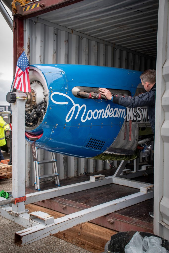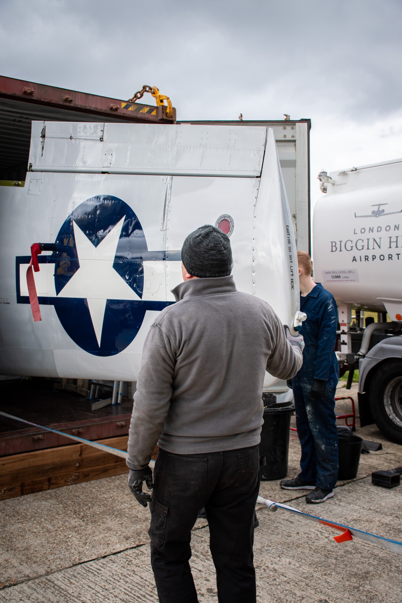 Biggin Hill engineering team spent the day unpacking the container and carefully assembling the aircraft. Below are some images from the unloading process—stay tuned for more updates on the reassembly! Follow the Biggin Hill Heritage Hangar Facebook page for the latest progress as Moonbeam McSwine prepares to take to the skies once again.