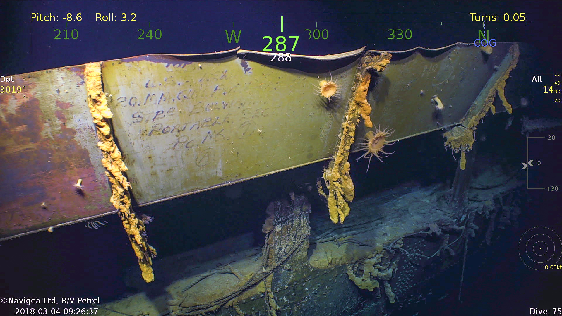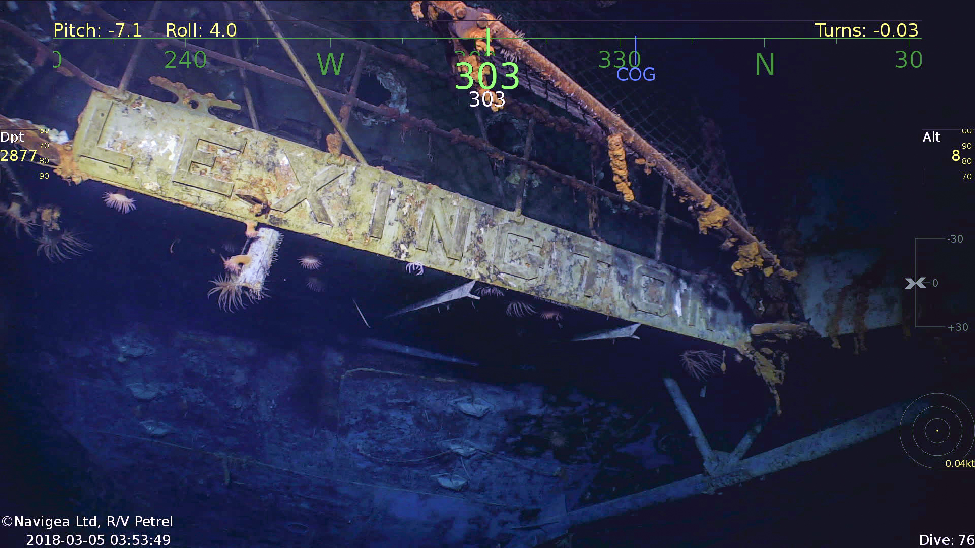 Seattle, WA, March 5, 2018 – Wreckage from the USS Lexington was discovered on March 4, 2018, by the expedition crew of Research Vessel (R/V) Petrel, which is owned by Microsoft co-founder and philanthropist Paul G. Allen. The Lexington was found 3,000 meters (approximately two miles) below the surface, resting on the floor of the Coral Sea more than 500 miles off the eastern coast of Australia.