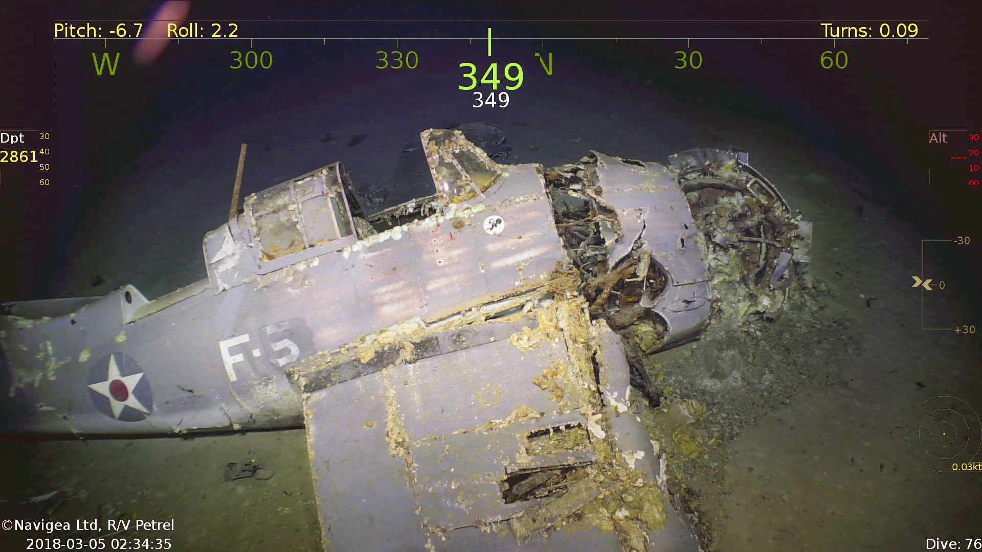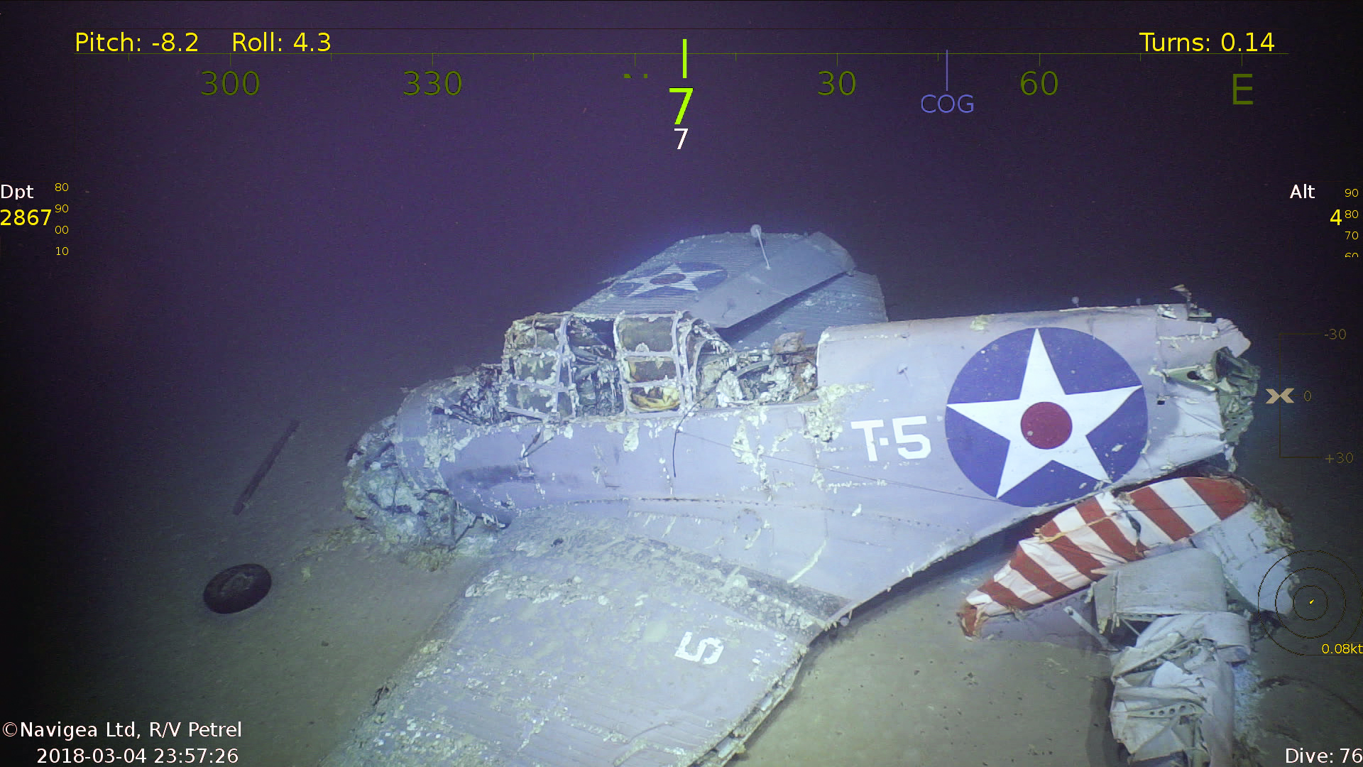 The sight of the ship’s name “LEXINGTON” still showing proudly on the warship, was profoundly moving, but for the aviation historians among us, it was the images of three separate Douglas TBD-1 Devastators which was maybe the biggest surprise. There is not one single example of a Devastator in preservation, and to see these substantially intact survivors, with their markings almost perfectly preserved, was truly remarkable. Another image showed a Grumman F4F-3 Wildcat with four victory markings and the famous “Felix the Cat” emblem of VF-3 on the cockpit sides. Altogether the expedition discovered the remains of seven TBD Devastators, three SBD Dauntless and a single F4F Wildcat.