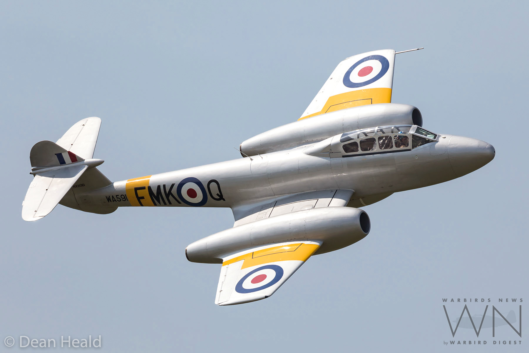 Meteor T.7 WA591 rolled off Gloster’s production line at Hucclecote in mid-1949. She served with the Royal Air Force at various domestic training establishments including Stradishall, Driffield, Finningley, and the College of Warfare at Manby, before retiring from flight to become a ground instruction airframe with No.5 Maintenance Unit at RAF Kemble in 1965. She closed her RAF service as a gate guard at RAF Woodvale, near Liverpool, but eventually ended up on the gate at the now-closed British Aerospace Factory at the former RAF Woodford airfield by the mid-90s. An enterprising fellow named Collin Christopher Rhodes acquired her in 1993 for restoration to airworthiness with The Meteor Flight. Following sixteen years of hard work in cramped conditions at Yatesbury, and a lot of capital investment, WA591 took to the skies again at Kemble on June 14th, 2011, when she became the oldest active jet aircraft in the world. She subsequently joined the now-moribund Classic Air Force and appeared on the air show circuit a number of times in the following years, until Classic Air Force’s primary owner, Mike Collett, decided to part with the bulk of his fleet of airworthy historic aircraft in 2015. With the Meteor’s future now more assured, she will hopefully become a regular performer with Planes of Fame in the coming years. We look forwards to seeing her in the air during the 2021 Planes of Fame Air Show next May!