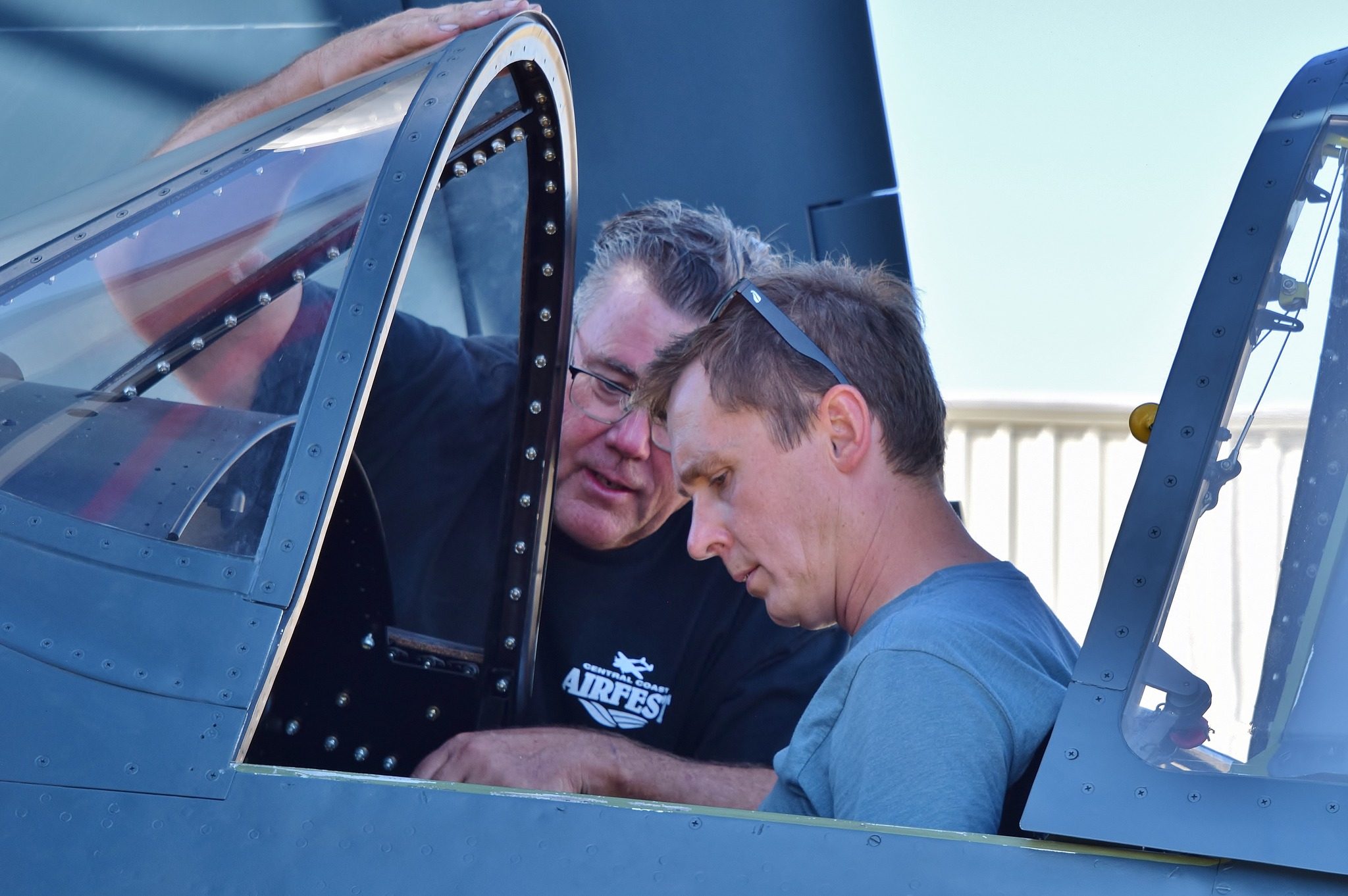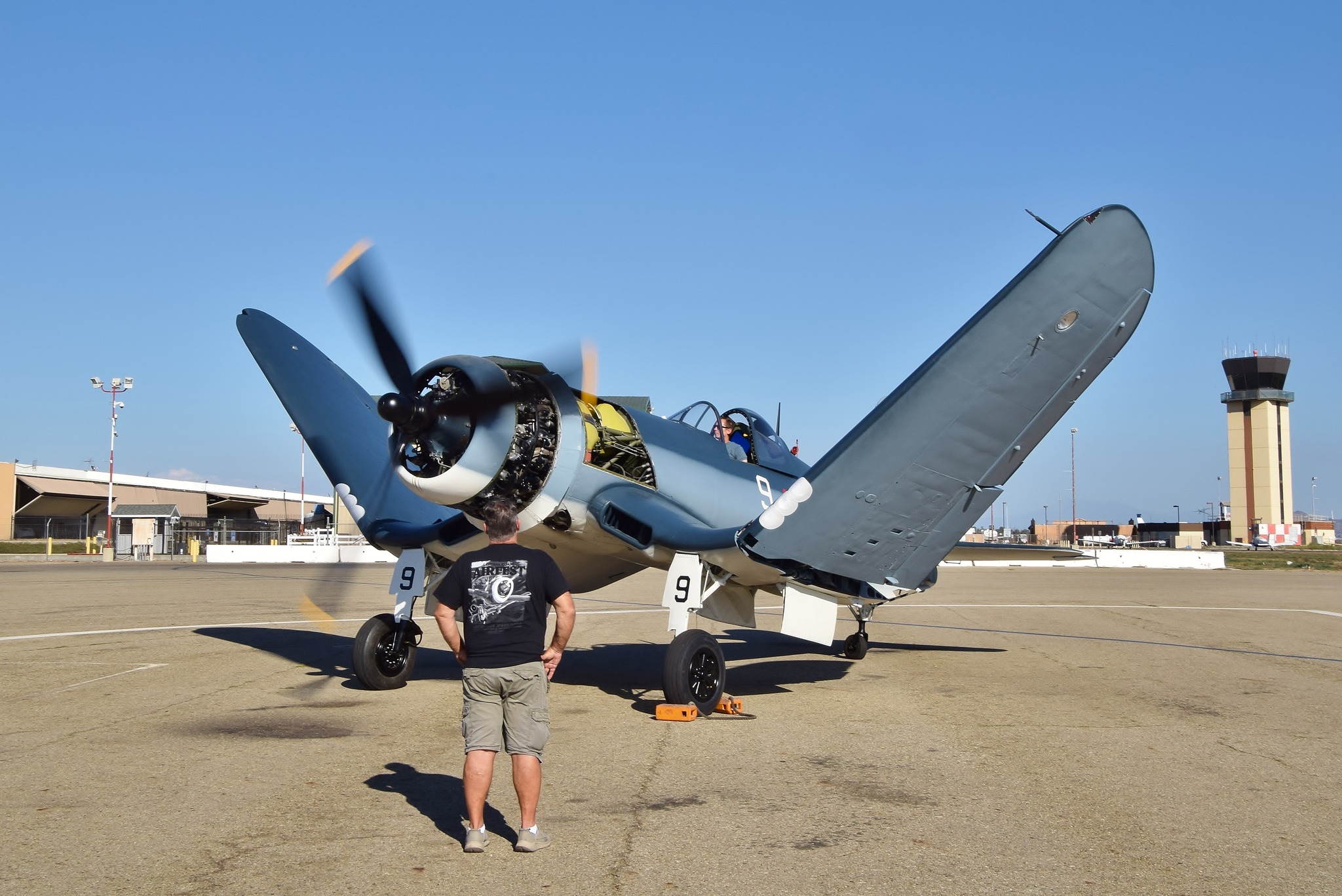After its cross-country trek to Missouri, the Corsair was the center of a large event at Columbia Regional Airport, where Purdy was overwhelmed by the number of people who came from near and far to see the former pilot back with his aircraft. While Purdy was not able to climb back into the cockpit, he repeated his wartime gesture of patting the belly of the aircraft, to show his respect to the plane. Since 17799 has a jump seat fitted in the small space behind the cockpit, Purdy’s children, Gayla Maier and Greg Purdy, were able to fly in the very same Corsair that their father flew some 70 years prior.