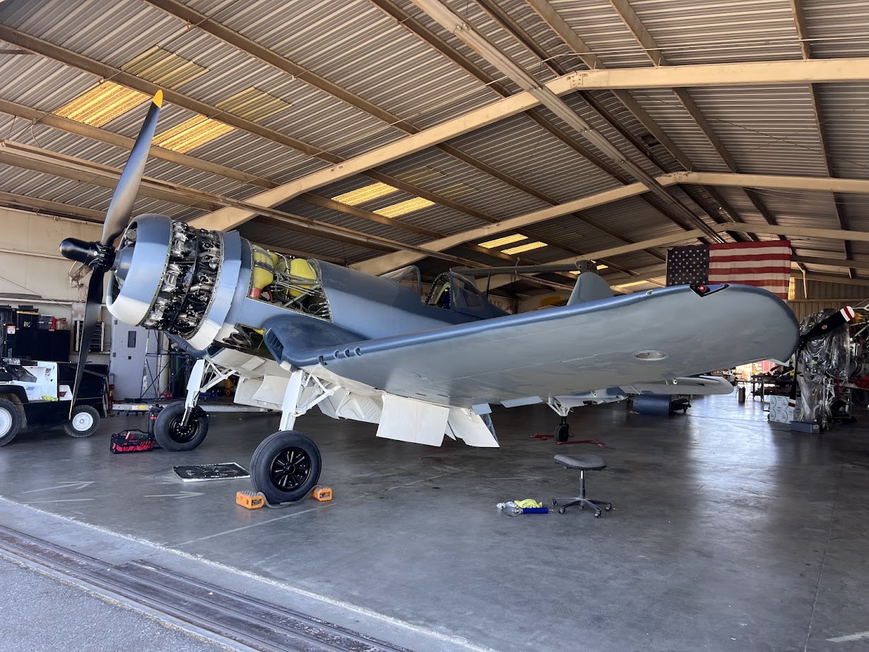 Not long after Tashjian’s honor flight, F4U-1A 17799, still wearing its Devotion paint job, was brought into the hangar of California Aerofab, just across the way from Planes of Fame at Chino. Here, shop owner Matt Nightingale led his team to work on the aircraft for an overhaul. Originally, it was to be a quick turn-around that would involve a new paint scheme being applied and a standard Inspect and Repair As Necessary (IRAN), but like many 80-year-old WWII aircraft, there is always something to fix under the cowling, and consequently, 17799 stayed in the hangar for a more extensive overhaul, with the outer wings being placed in specially-constructed jigs, the horizontal and vertical stabilizers removed for repair and repaint, and the fabric covered control surfaces were removed for inspection and recovering.