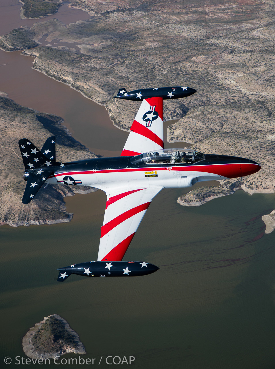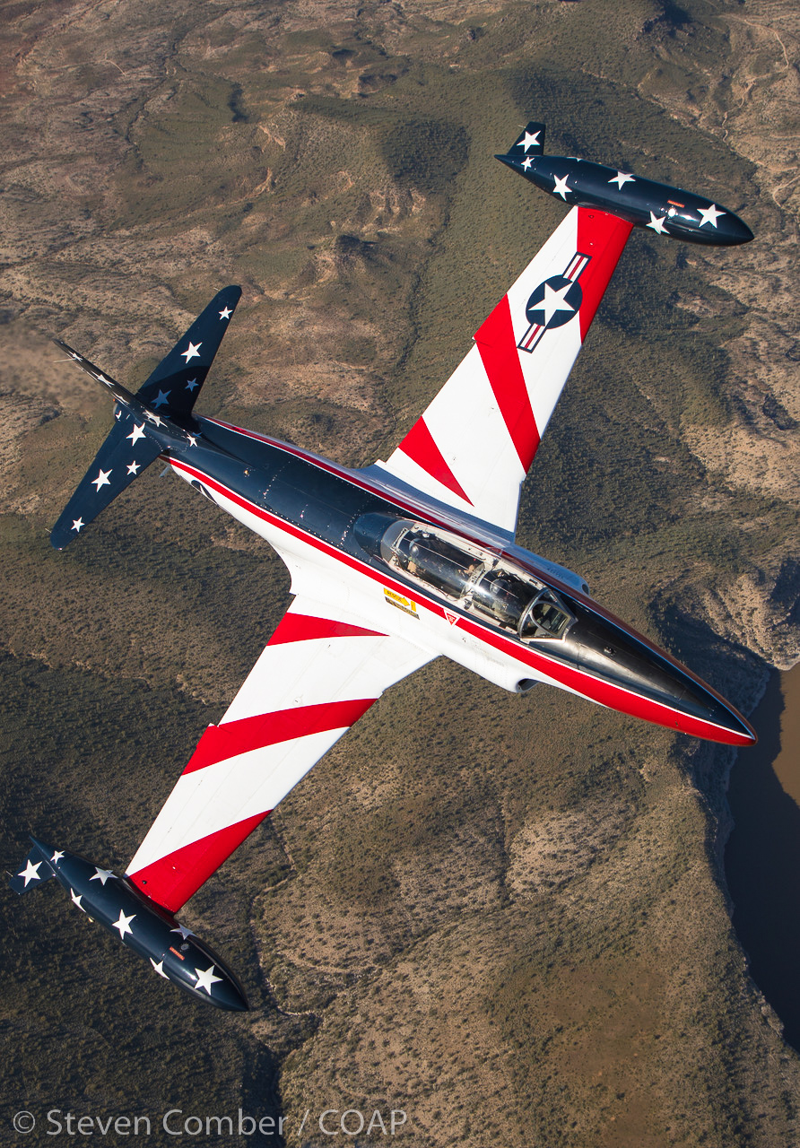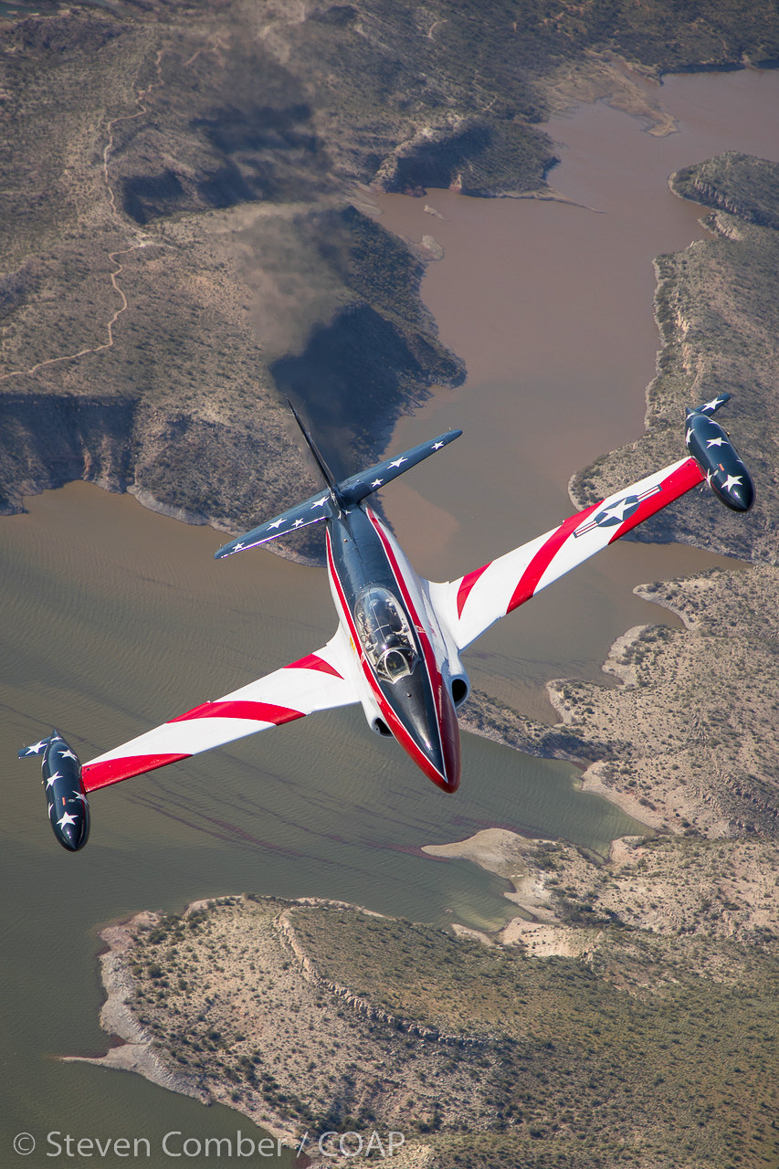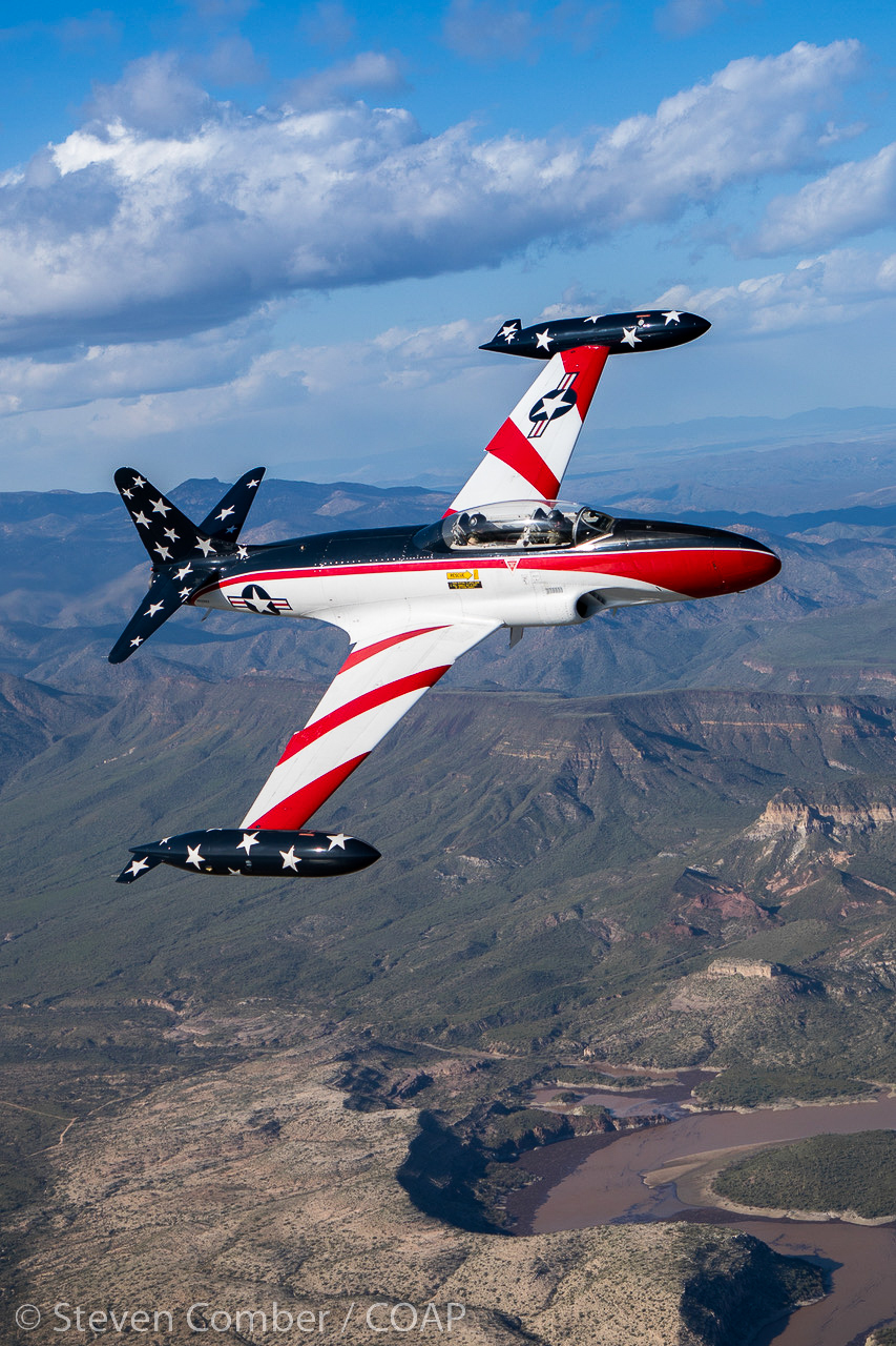 The next sortie was a mammoth orchestra of four sessions in two airspace locations involving four different aircraft. First up was the Dillon-owned T-33 in a strikingly colourful USAF Thunderbirds scheme. We positioned him over Lake Pleasant to make those details really stand out, with Steve Comber calling the shots to get the light and the backgrounds to match the beauty of the scene. Superb flying! It’s all about the photography. Always!