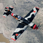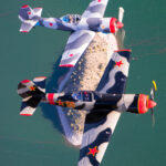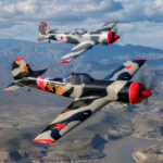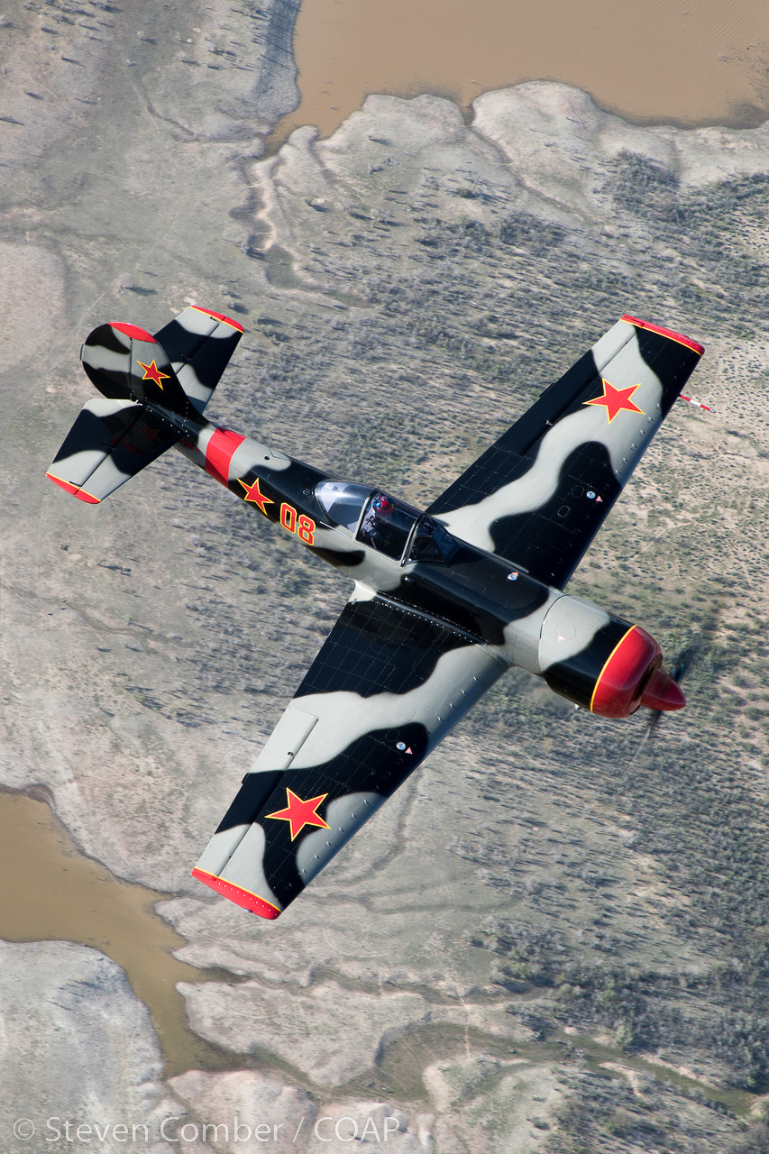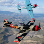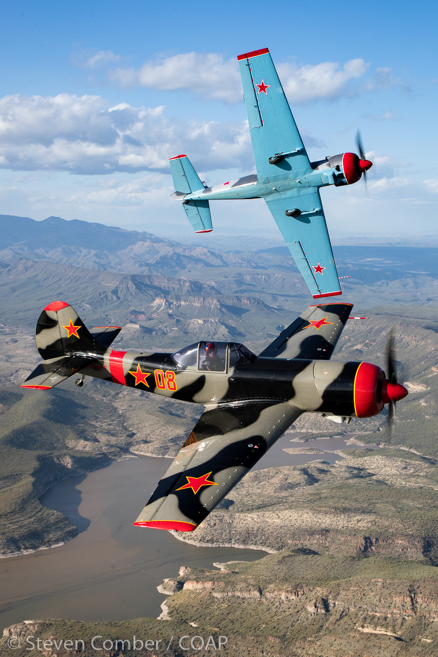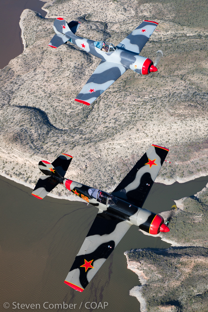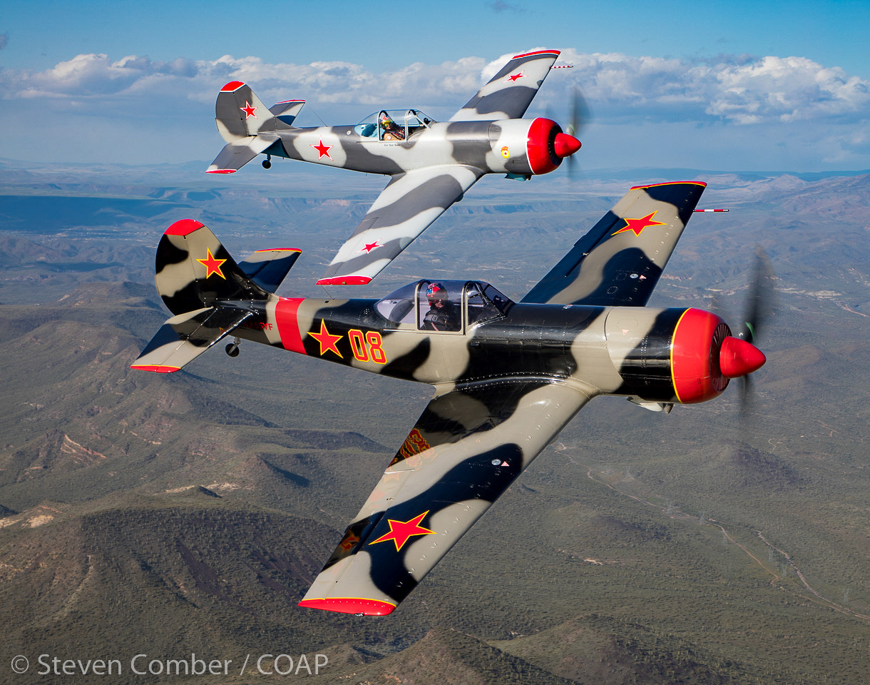 “Red Thunder”, the USA’s only two-ship Yak-50 aerobatics team forms up on the photoship. Barry ‘Bdog’ Hancock is flying NX55YF (foreground) and Karl Gash Gashler is flying N92GG (background). (photo by Steven Comber/COAP)