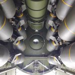 The type was incredibly innovative for its use of a remote-controlled, gun-sighting system guided by an analog computer. Except for the tail position, the aircraft’s gunners no longer sat in turrets, but rather at ‘sighting stations’ using a remote periscope sighting system for the turrets which had switches to obtain or relinquish control of the four turrets; the top turret gunner/central fire control officer had switches for changing control as to which gunner was on the target depending on his field of view; the gunners communicated via the interphone system. The bombardier was generally responsible for the forward dorsal 4-gun turret and the forward ventral 2-gun turret for frontal attacks. Armament in this aircraft includes: twin-mounted General Electric .50 caliber machine guns in remote-controlled forward and rear ventral turrets and a ventral rear aft turret, and quad-mounted .50 cal. in a remote-controlled forward dorsal turret, and pair in the tail turret (armament varied in these aircraft , with some having a 20 mm cannon was added to the tail turret). Typically each crew had ten men, or eleven when radar was used, and these consisted of: Aircraft Commander (pilot), co-pilot, bombardier, flight engineer, radio operator, navigator, right gunner, left gunner, top gunner/central fire control officer, tail gunner, (and radar operator). The top gunner sat in a pedestal seat nicknamed the “Barber’s Seat.” Due to the B-29’s complexity, the flight engineer (who sat facing aft behind the co-pilot) had an essential role in flying the aircraft; he was responsible for the minute-by-minute monitoring and control of the engines. Each crew position was fitted with a 1936 Ford ashtray. The aircraft could carry a wide range of ordinance in its large forward bomb bay and its smaller one to the aft.