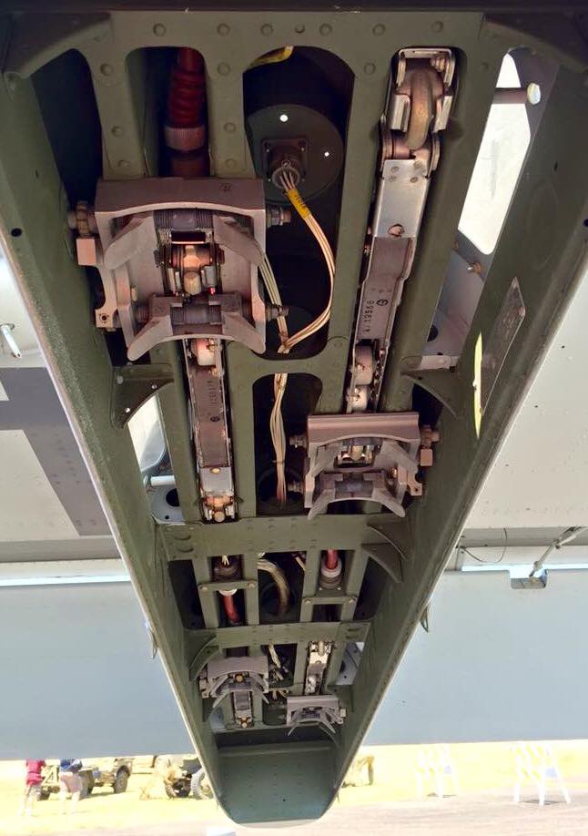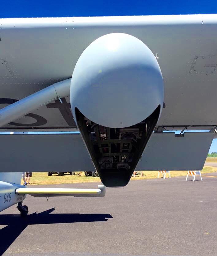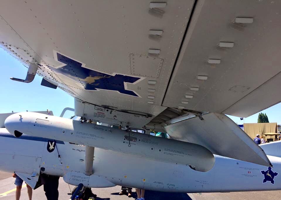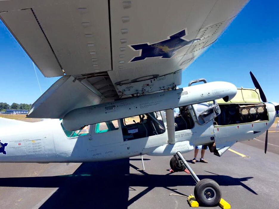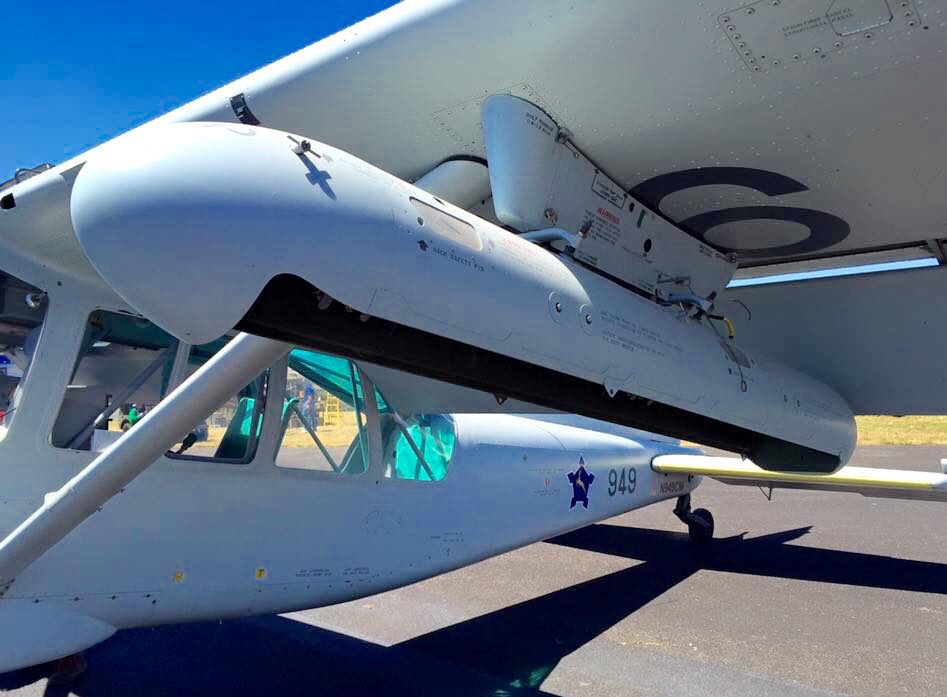 Reconnaissance pod attached to an underwing pylon on Aermacchi AM.3CM Bosbok (Bush-buck), N949CM at McNary Field, Salem, Oregon. (Randy Malmstrom)