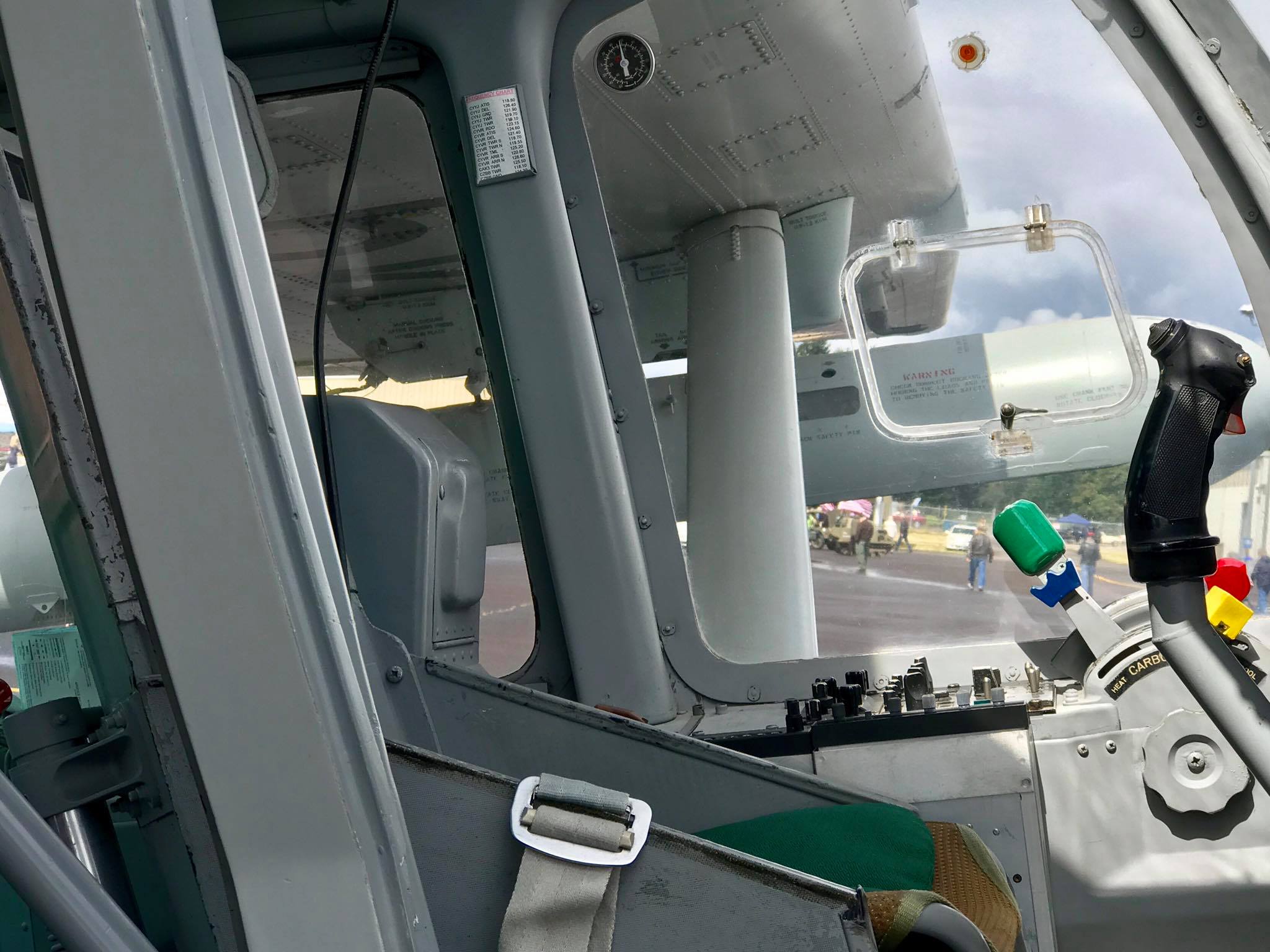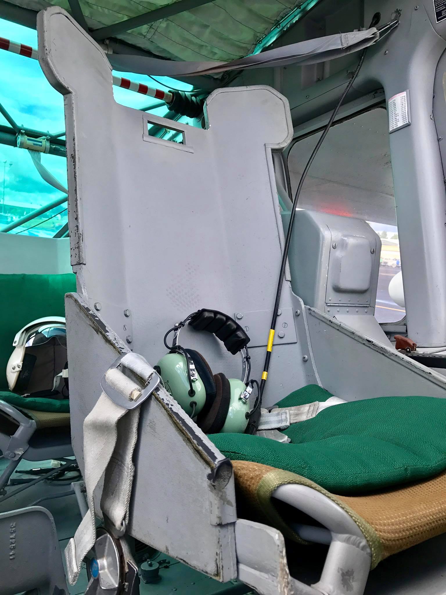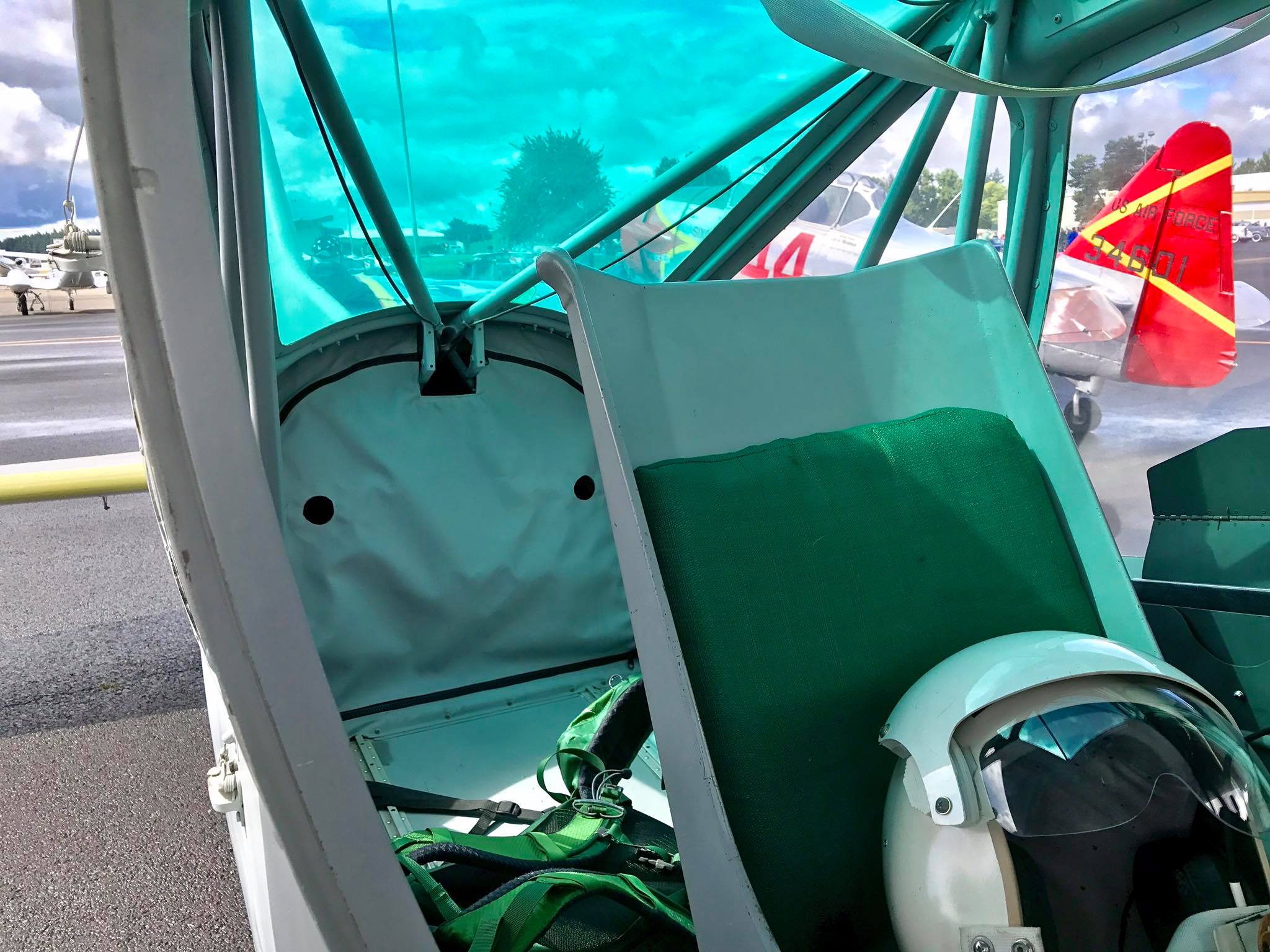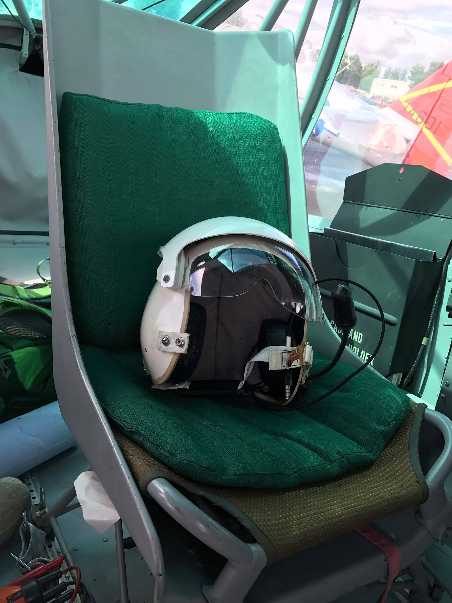 Pilot’s helmet on the forward pilot’s seat of Aermacchi AM.3CM Bosbok (Bush-buck) N949CM at McNary Field, Salem, Oregon. (Randy Malmstrom)