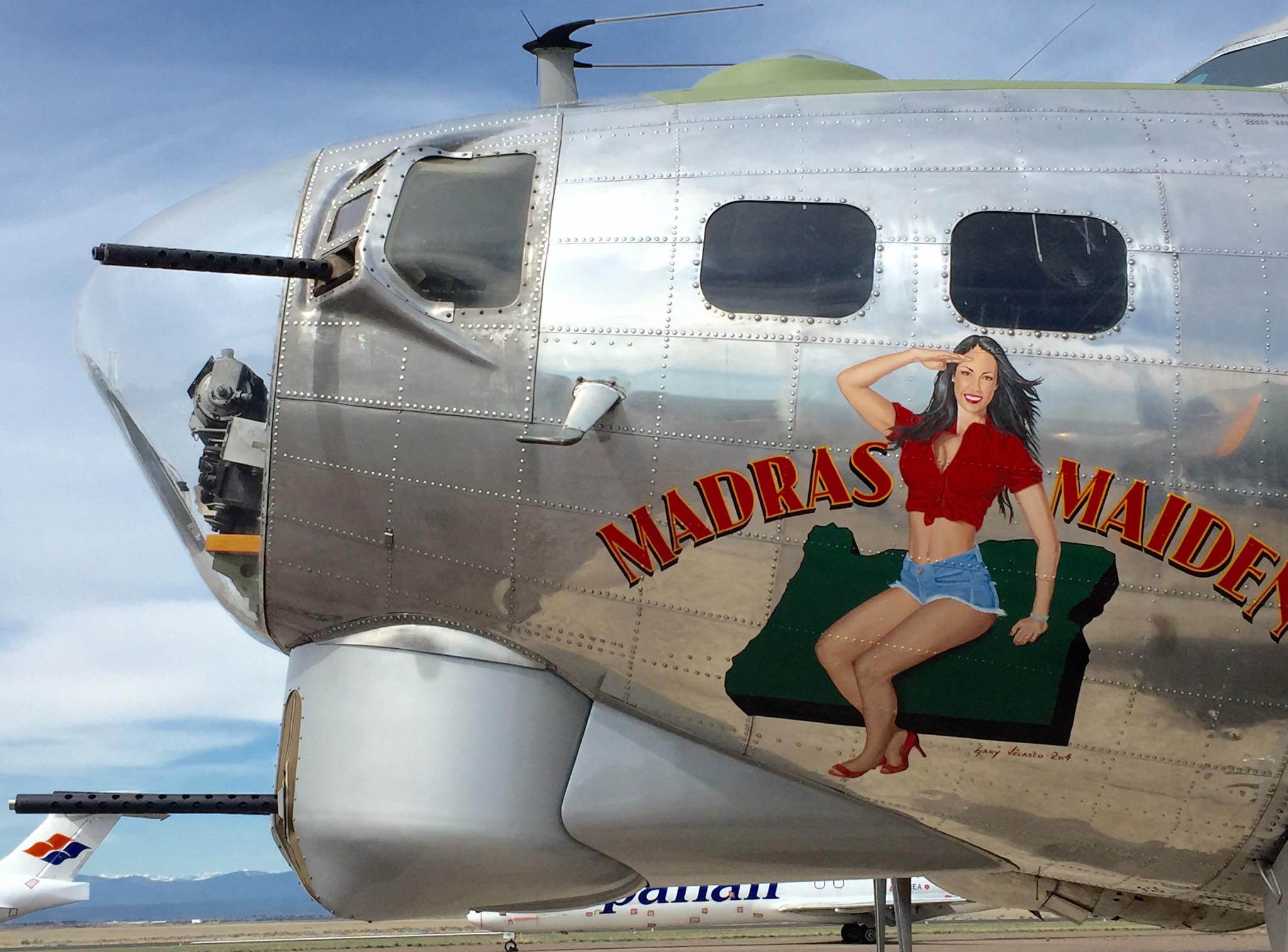 In 2010 it went to the Jerry Yagen at the Military Aviation Museum in Virginia Beach, VA. Jack Erickson’s Fortress LLC acquired it in 2013 (and received its new FAA certification in 2015) for display and flying at Erickson Aircraft Collection in Madras, OR. When it was acquired there, it was repainted as Madras Maiden and it had an unpainted aluminum skin and had the L-Triangle tail code of the 381st Bomb Group that was based at RAF Ridgewell during World War II (fitness model Hope Beel was used as the model for nose art).