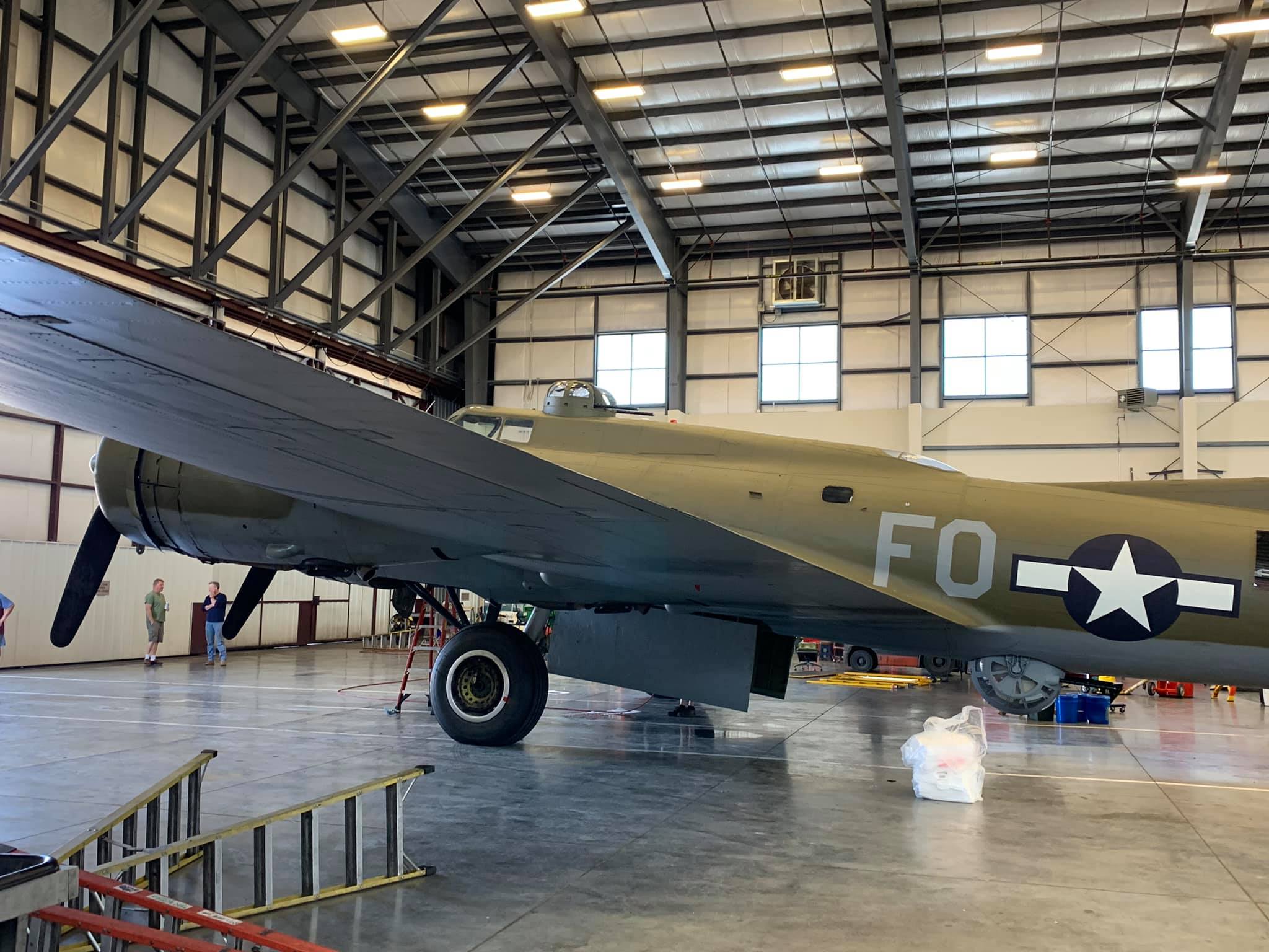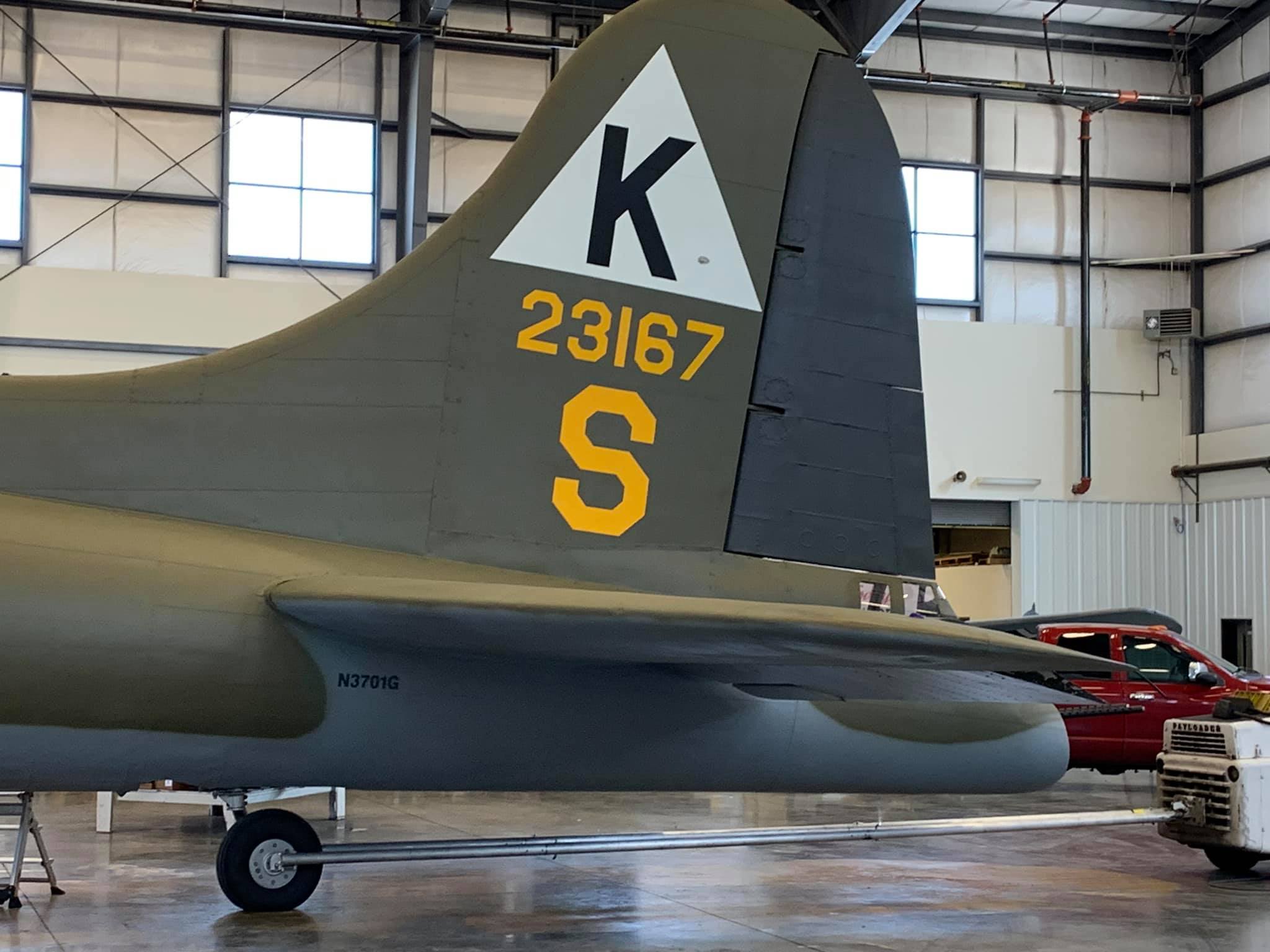 In January 2019, the aircraft was leased from Erickson by the Liberty Foundation and painted as Ye Olde Pub #42-3167 of the 379th Bomb Squadron — known as the Triangle K Group — piloted by 2nd Lt. Charles L. “Charlie” Brown. That aircraft is noteworthy for what is sometimes referred to as the “Charlie Brown and Franz Stigler Incident” of December 20, 1943 after a bombing run over the Fw 190 production facility at Bremen, Germany. That aircraft was very damaged and, to make a long story short, Oberleutnant Stigler flew his Bf 109 on the port side of the stricken aircraft, acting as an escort until reaching the open waters of the North Sea whereupon Stigler saluted and returned to his home field.