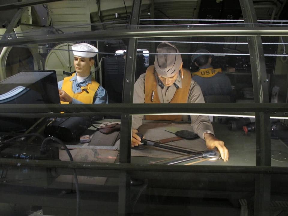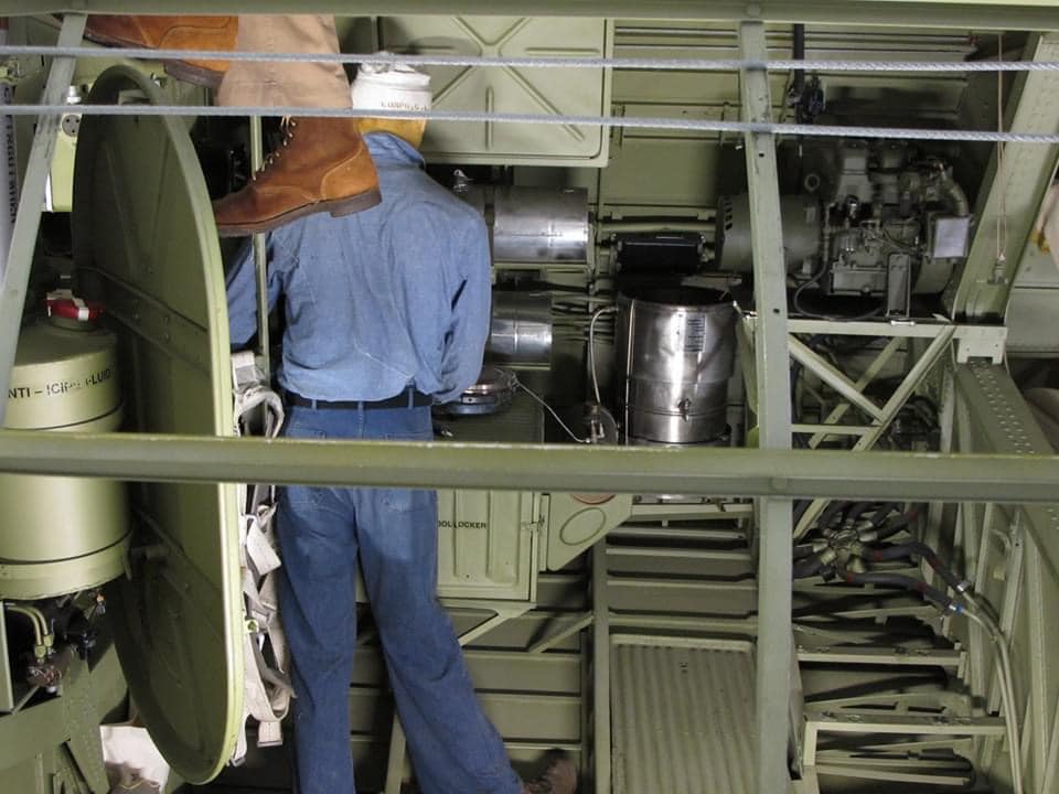 Powerplant: a pair of Pratt & Whitney R-1830 Twin Wasp radial engines. They were mounted on a parasol wing, which was on a central pylon that raised the engines in an effort to clear the propellers of some of the sea spray—the clearance from propeller blade to water surface was 8.5 ft. Unique among most other flying boats of the time were the retractable wingtip floats. By the PBY-5 versions, the craft was an amphibious aircraft and was fitted with hydraulically actuated, retractable tricycle landing gear. The hull is divided into seven crew compartments divided by bulkheads, although as I recall, there are only five main watertight compartments fitted with watertight doors in the bulkheads: bomber/bow gunner’s compartment; cockpit compartment, navigation/radio compartment; flight mechanic/engineer’s compartment; living quarters compartment; waist gunner’s compartment; ventral (tunnel) gunner’s compartment.