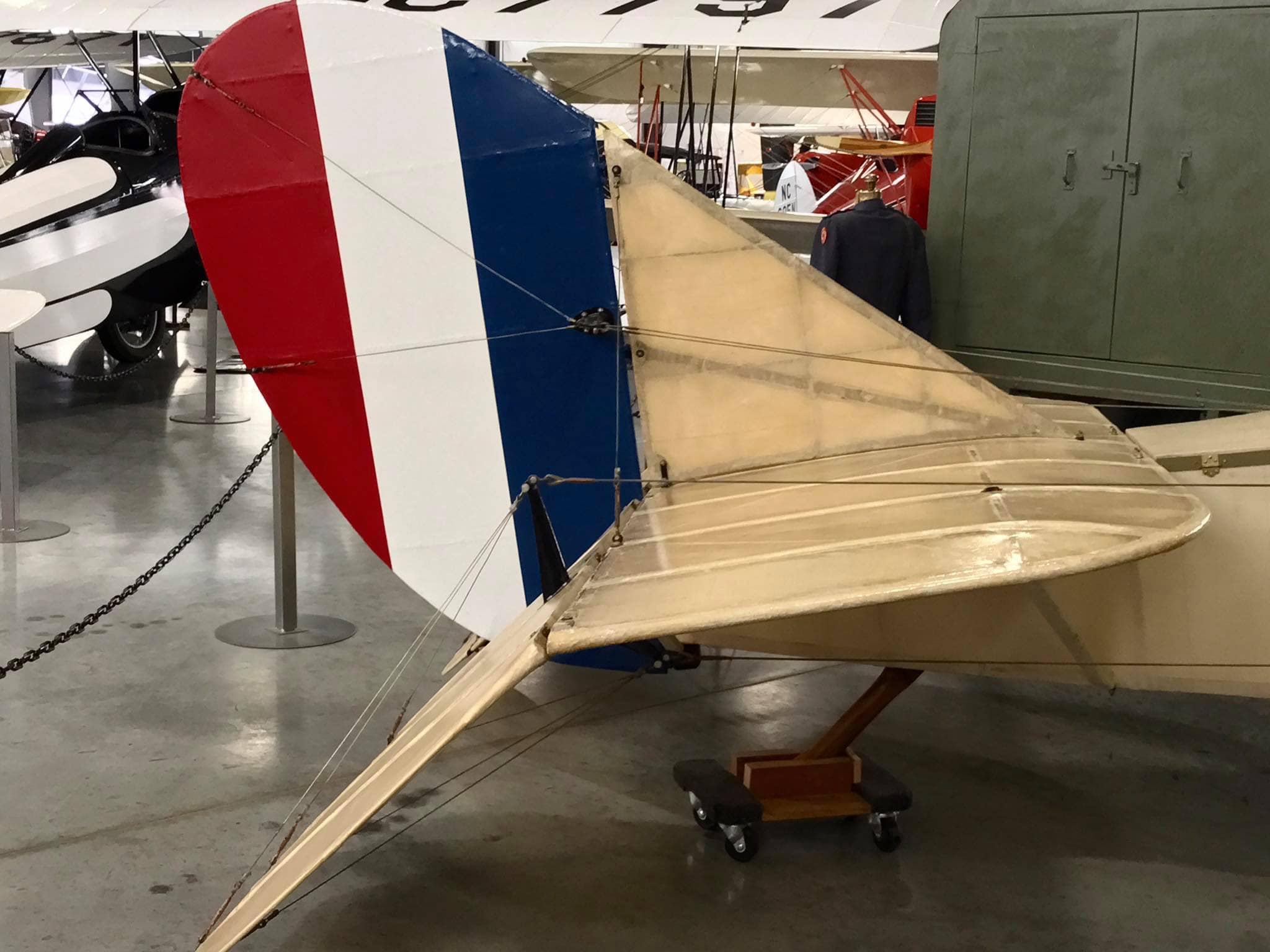 As far as fin flash, in 1917, the US Army Air Service adopted the pattern of blue forward and red farthest aft (the same as French WWI aircraft); and in January 1918, the order came down to switch the pattern; and in August 1919, the original 1917 pattern was re-adopted. However, some aircraft never got changed during the 1918 era, resulting in both sequences being visible in vintage photos of Jenny aircraft in service in the United States. Possible armament: a fixed, forward-facing twin .30 cal. Marlin machine gun mounted on the cowling and synchronized through the propeller; a 30 cal. Lewis machine gun on a scarf ring universal mount on the rear cockpit; and bomb racks. My photos at WAAAM in Hood River, Oregon, where, as of this writing, almost all of the 75 aircraft on display are flightworthy.