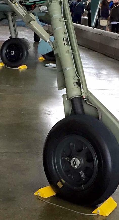 Note that in this vintage of Fw-190 there is a spring-loaded pulley on the canopy to keep the antenna wire taught regardless of the the canopy’s position; this was skipped on later 190’s such as the D-13 Dora (I have photos of that aircraft without the pulley). Flaps are metal whereas the Dora uses wood. Also, since the canopy rails are not parallel the canopy has a hinge on the top to make it flexible. There is a cable from the right landing gear strut to the tailwheel that retracts the tailwheel when the main gear goes up; there is an access panel on the left side of the tail fin to adjust the cable mechanism (see photos and diagrams). The right wheel rim of the aircraft is painted red indicating synthetic fuel (as far as I have determined).