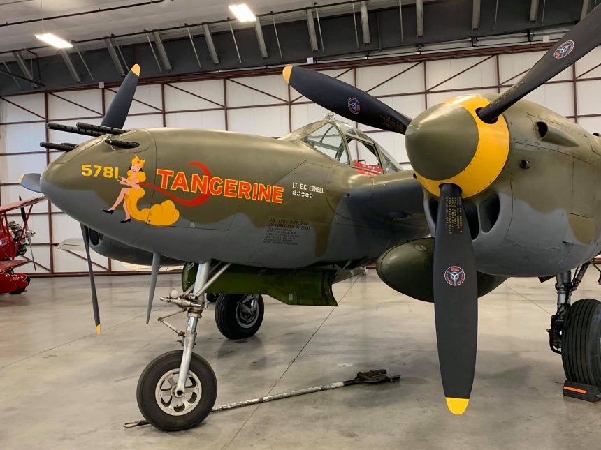 It is painted as P-38F-1-LO, s/n 41-7654, aircraft nose # 5781 Tangerine piloted by Ervin C. Ethell who flew with 48th Squadron, 14th Fighter Group, based at Youk les Bains (a cow pasture which served as an air base) in Algeria, North Africa in 1942. That original Tangerine was shot down while being flown by another pilot, and Ethell then flew Tangerine II. While in Algeria, the 48th flew escort missions for B-25’s and B-26’s, made fighter sweeps, and flew reconnaissance missions.