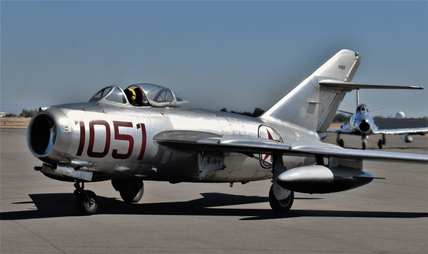 This particular aircraft is painted in the markings of the Korean People’s Army Air Force — perhaps from either the 8th or the 60th Air Fighter Wing — and is flown by Planes of Fame. It is perhaps the sole MiG-15bis still flying.