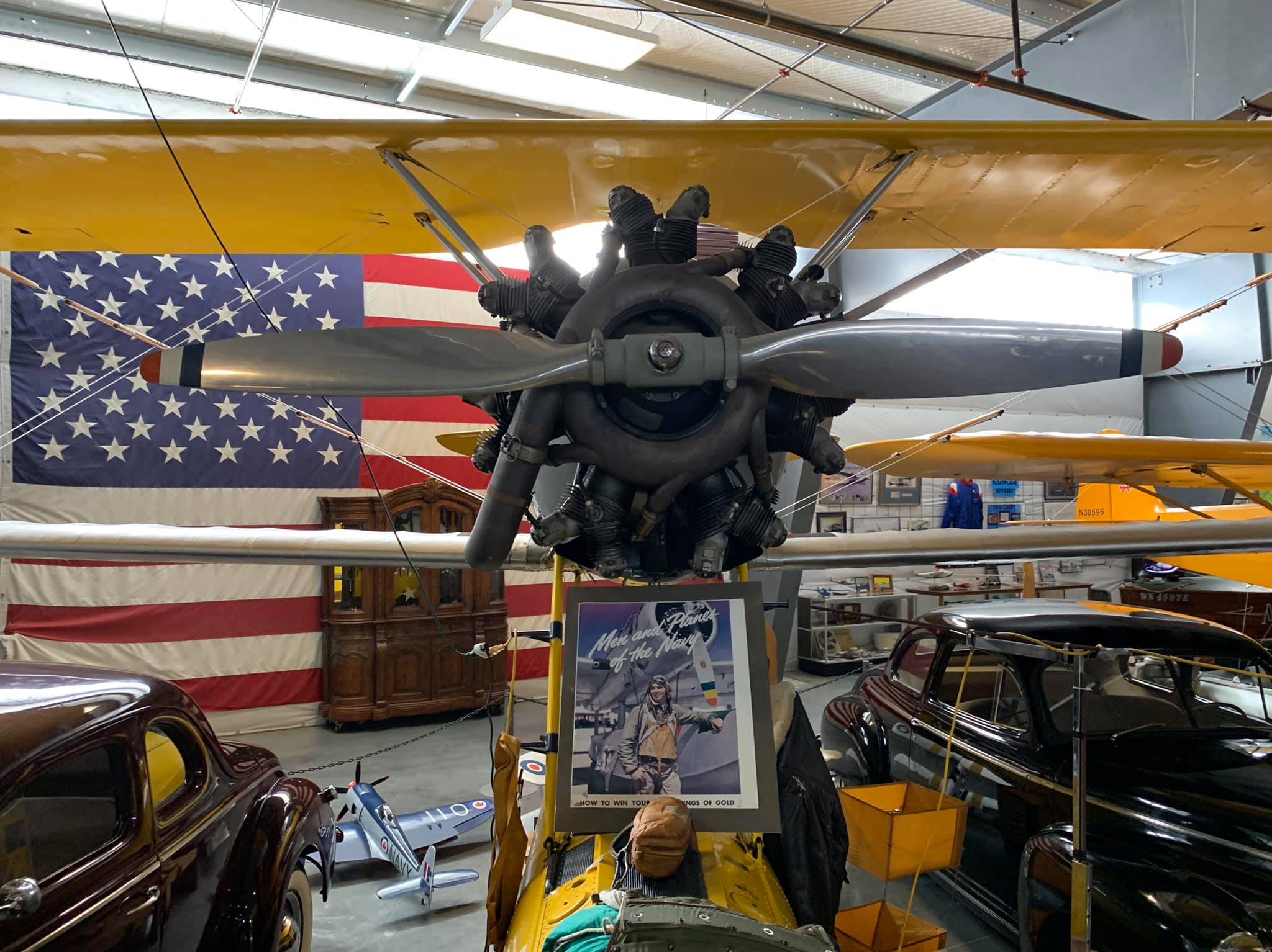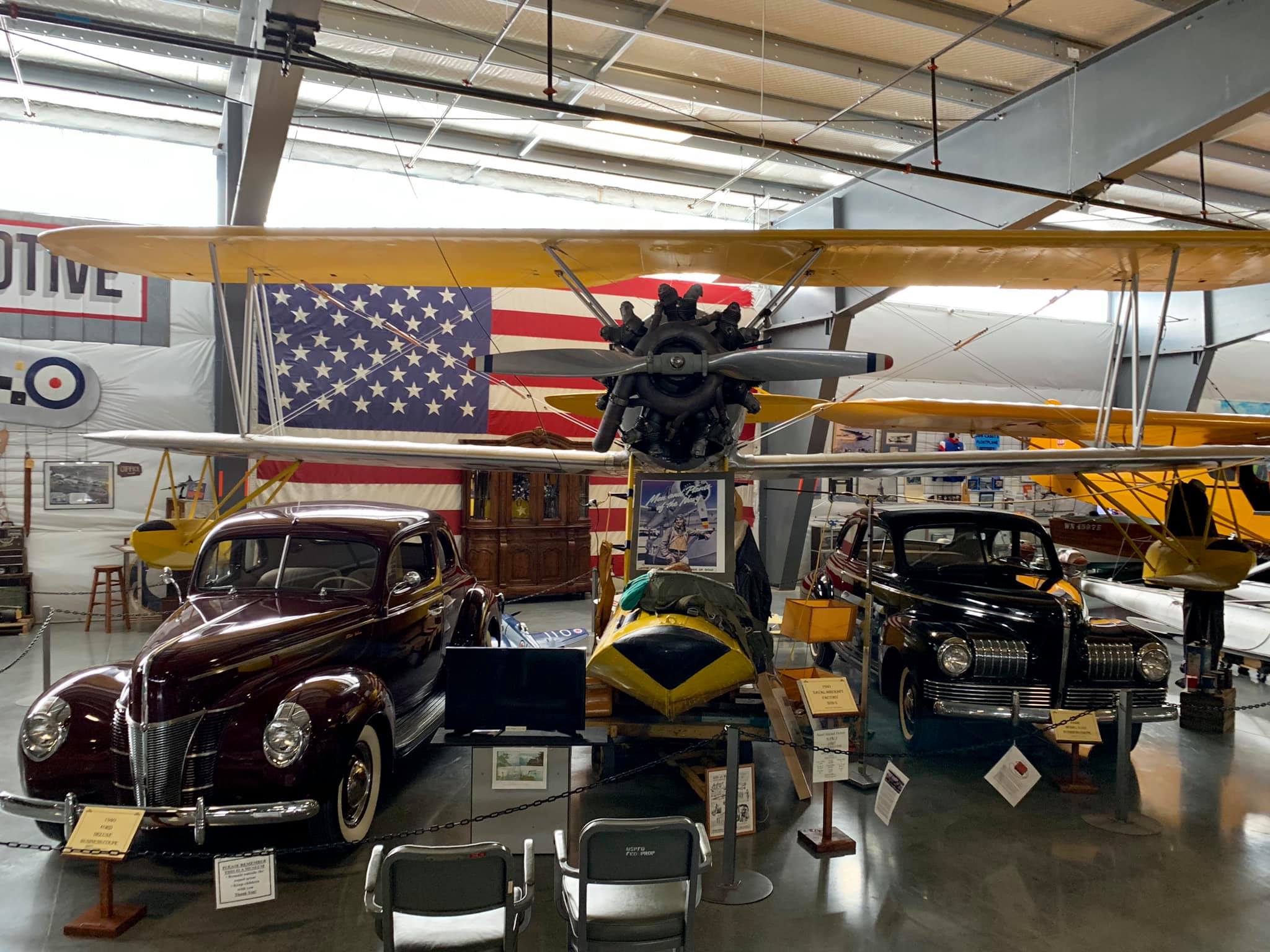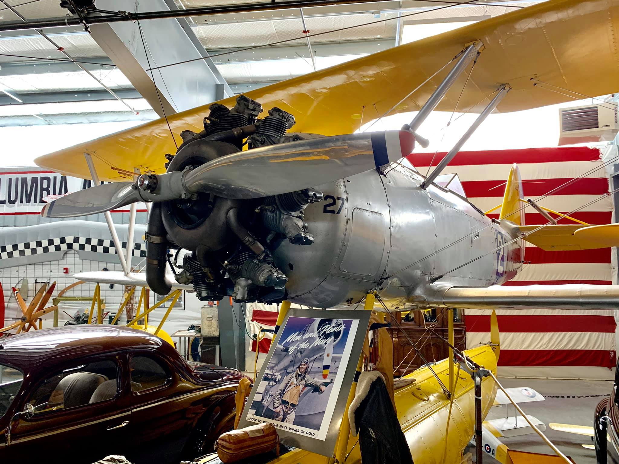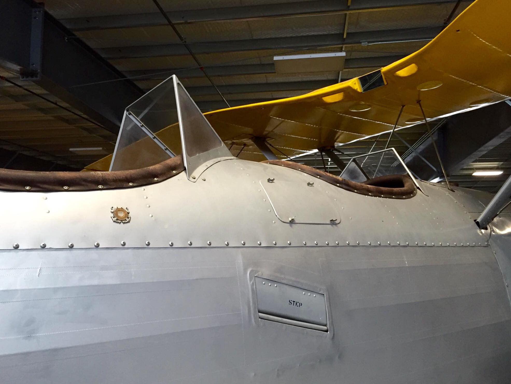 It was restored by high school teacher Bob van Vranken of Suisun, California, who took the aircraft on an over 6,000-mile flying tour of the U.S. in 1980. It was then acquired by Western Antique Aeroplane & Automobile Museum (WAAAM) founder Terry Brandt in the late 1980’s. The float equipment was acquired from Reggie Tufts, a retired U.S. Air Force mechanic from Sacramento, California. As has been common practice, the factory-equipped engine cowling has been removed (as mentioned below, this made for ease of maintenance, and the cowling did little to reduce drag). A listing of surviving examples of the aircraft type lists a number of them on display, and it appears there are at least a few flying; this one has flown since it has been located on the Columbia River. My photos of this aircraft are at WAAAM, located in Hood River, Oregon.