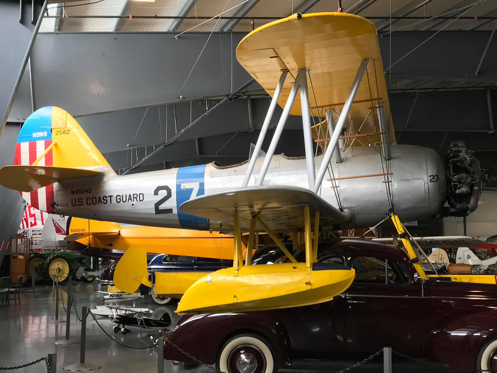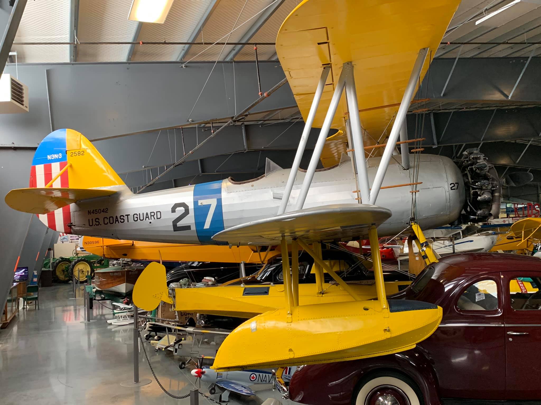 Naval Aircraft Factory N3N-3 Canary (“Yellow Peril“), Bu. No. 2582. I am not finding details about the service records of this particular aircraft before its civilian life. It was apparently built in 1940 and is painted in the U.S. Coast Guard (USCG) markings of one of four N3N-3 aircraft that were transferred from the U.S. Navy to the USCG with serial numbers V193 through V196 in 1941 (V193 went to CGAS Elizabeth City, North Carolina; V194 and V195 went to CGAS St. Petersburg, Florida; and V196 went to CGAS Brooklyn, New York).