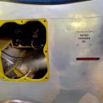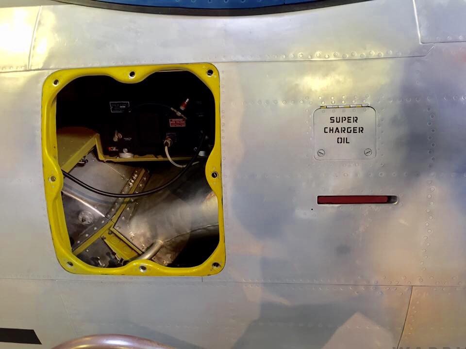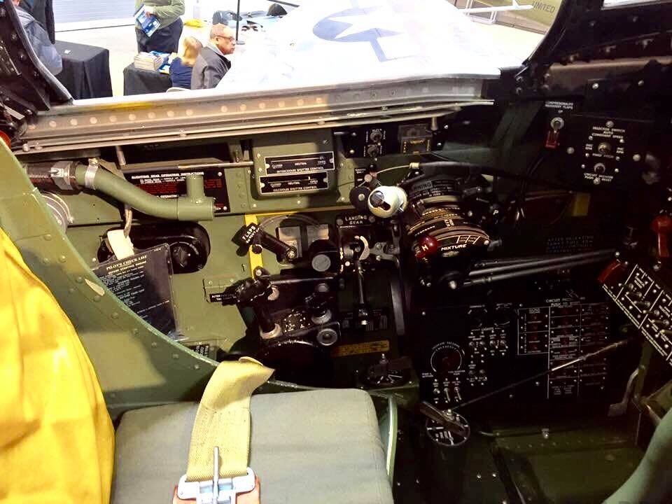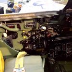 Regarding the P-47s technical details, the aircraft was fitted with a Pratt & Whitney R-2800-59 18-cylinder engine. She was armed with eight Browning .50 cal. machine guns – staggered due to the placement of the ammunition belts (note the stainless steel cooling jackets on the gun barrels). The fighter could also carry up to 2,500 lbs. of bombs or 5-in. unguided missiles mounted on wing hard points. Interestingly, the landing gear telescopes in and out nine inches, saving space in the wings. Furthermore, note the windscreen heater tube which leads from the right side of the front of the engine. You can see the engine blow-back on the port side wheel well cover but not much of any on the starboard side due to prop wash. Late in World War II, many U.S. fighters were fitted with an AN/APS-13 UHF tail warning radar system which had a post and loop fixture on the tail fin and a warning light (on the cowl) and an alarm bell (next to the pilot) – you can see the post and loop on the tail fin in some of the accompanying photos in this article. The tail warning radar could detect aircraft in a narrow arc up to 2,500 ft. from behind the aircraft – however when the P-47 flew lower than 4,000 ft. over terrain, the radar had a tendency of picking up reflections from the ground, improperly setting off the alarm. Almost as important, the radar could not differentiate between friend and foe. Another interesting detail you should be able to see on the port side of the cockpit interior are red IFF (Identification Friend or Foe) communications self-destruct buttons.