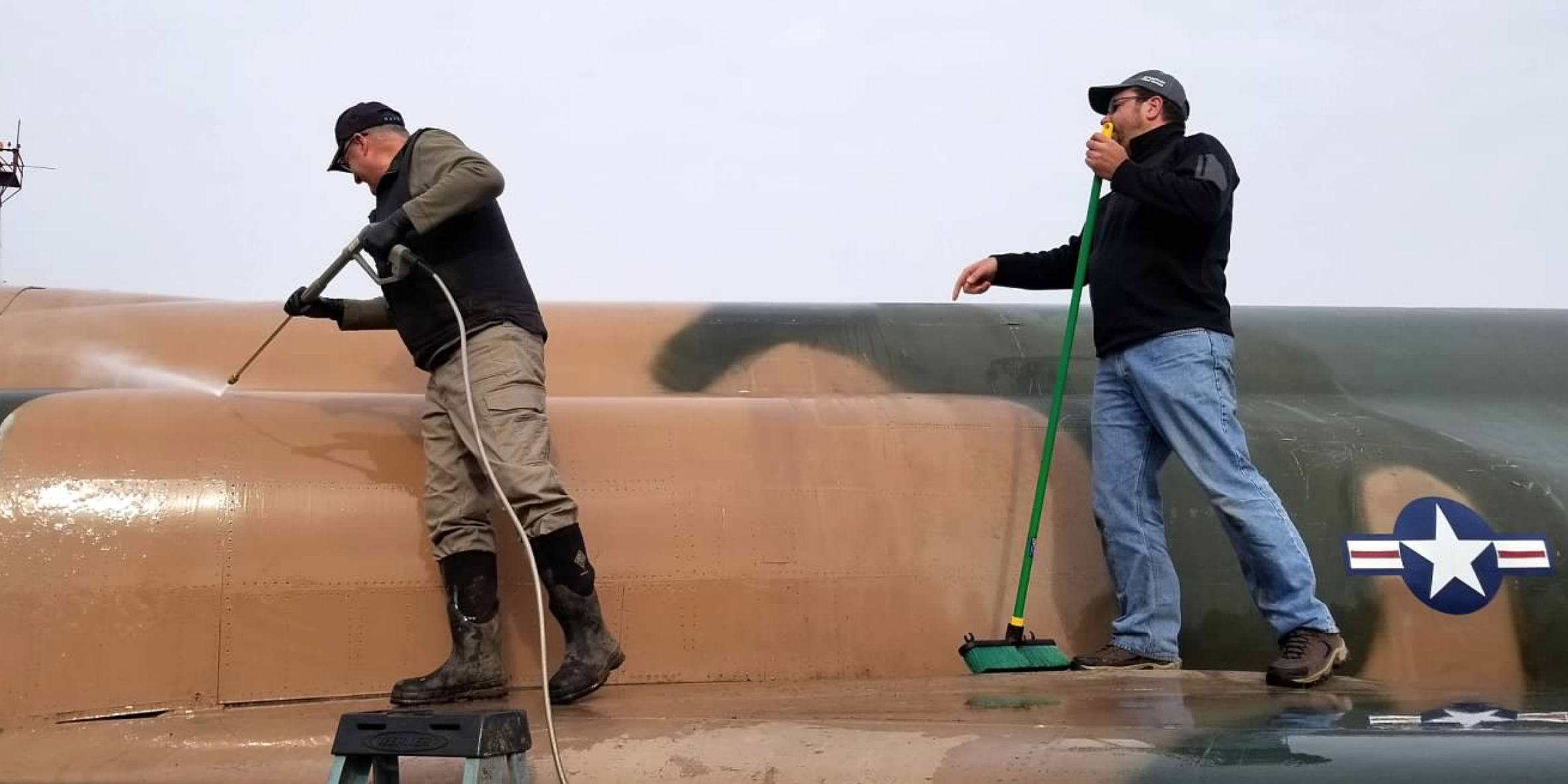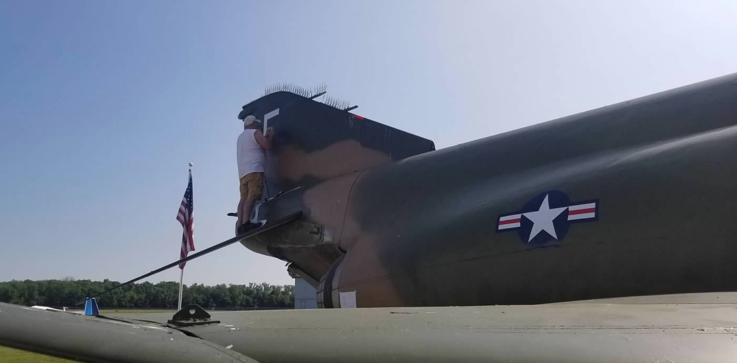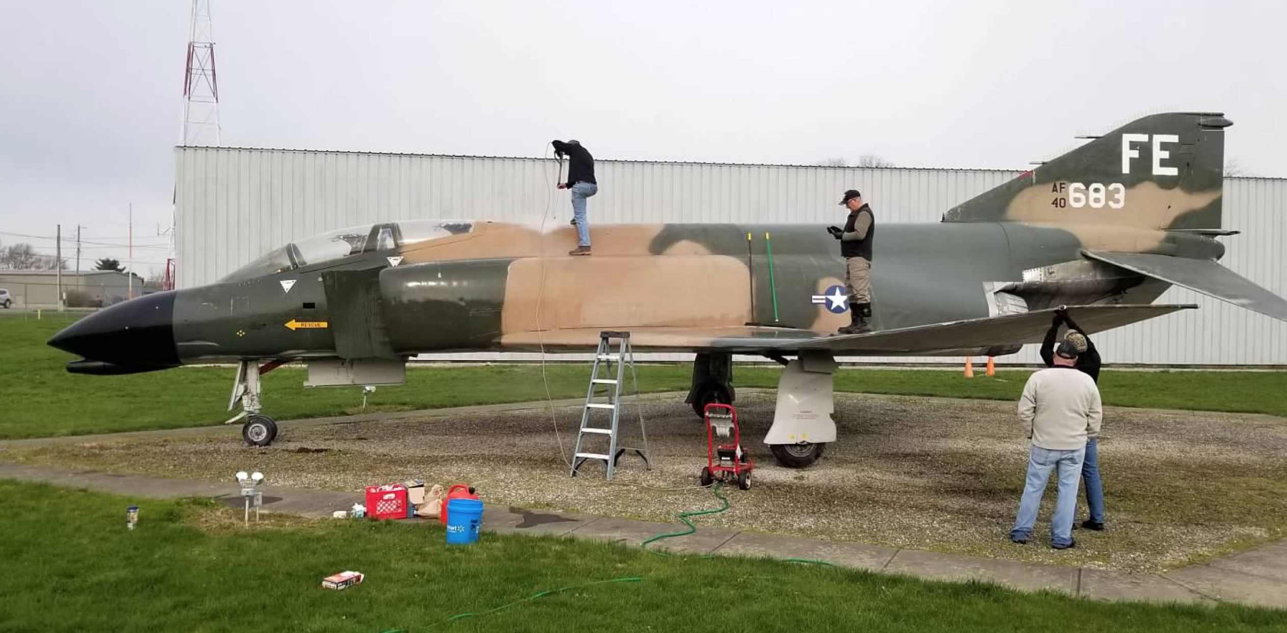 In the spring of 2020, the same old restoration team, as well as newcomers Ed Roo and Jeremiah Young, began to refurbish the F-4’s paint and markings. After a deep power-wash, we applied an even more accurate color scheme using precise Federal Standard which Shannon procured from a local suburban Sherwin-Williams store (thanks Shannon!). Michael Bates, working with a local signage company, produced high resolution markings that will be even more durable than the original painted markings.