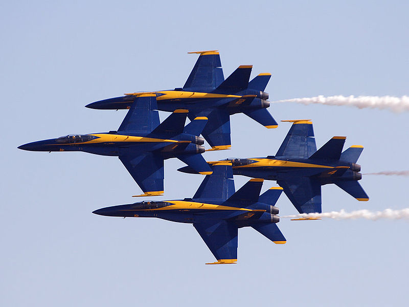 The Blue Angels F/A-18 Hornets fly in their signature tight diamond formation, maintaining a hair-raising 18-inch wing tip to canopy separation.The F/A-18 entered service in 1983 and is still serving the US Navy and Marines, and is the plane flown by the Navy’s Blue Angels flight demonstration squadron who switched to the Hornet in 1986. The supersonic fighter has had a role in nearly every military conflict the United States has been involved in since the eighties, and although it is designed for carrier based operations, the strength of the design and build has found Air Forces of countries without aircraft carriers purchasing the planes for their aerial defense needs including the Royal Canadian Air Force, Royal Australian Air Force, Finnish Air Force, Kuwait Air Force, Royal Malaysian Air Force, Spanish Air Force and the Swiss Air Force. The soundness of the platform has meant that though its successor is in production, the Boeing F/A-18E/F Super Hornet is an evolution of its predecessor, building on the existing design rather than a clean sheet of paper, incorporating the last 30 years of technological advances and breakthroughs in stealth technology into the new airframe.