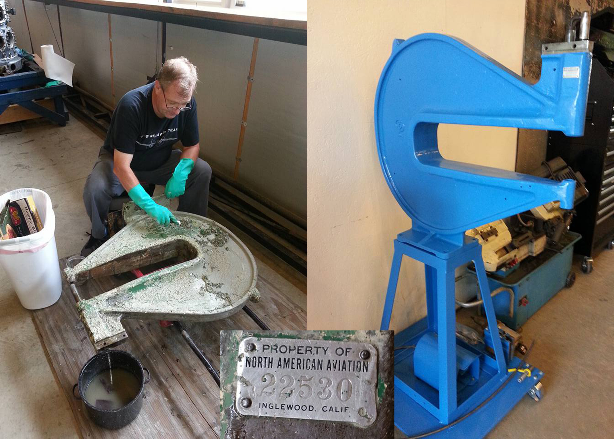 Also on this trip, the museum acquired a vintage pneumatic C rivet squeezer that came out of the North American aviation plant. Museum volunteers have restored the machine to as-new condition over the past few weeks, and it will now get back to work again on a North American aircraft restoration.