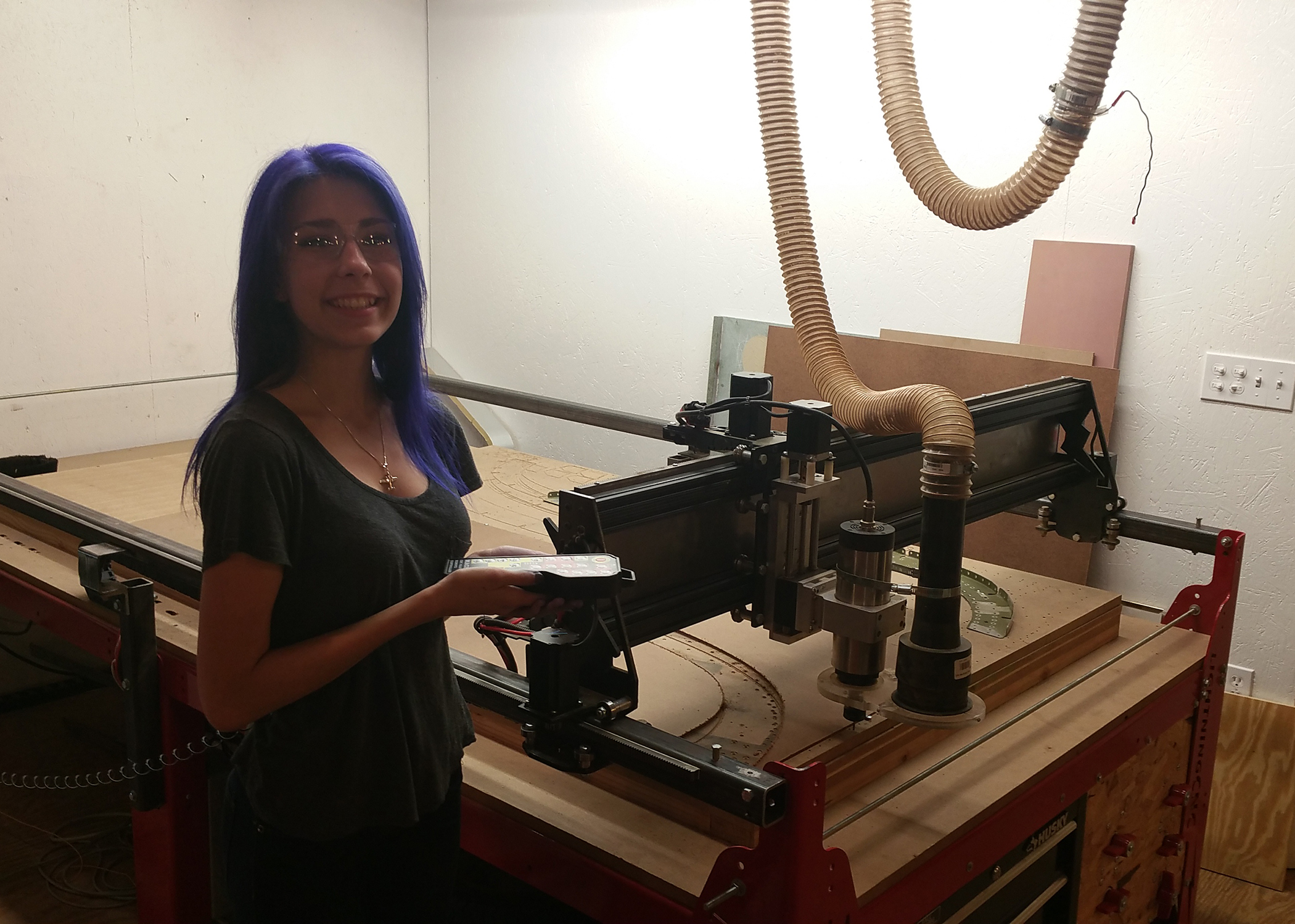 Sarah , one of the museum's youth restorers operates the CNC router making templates of B-25's  the upper fuselage section. (photo via Patrick Mihalek)
