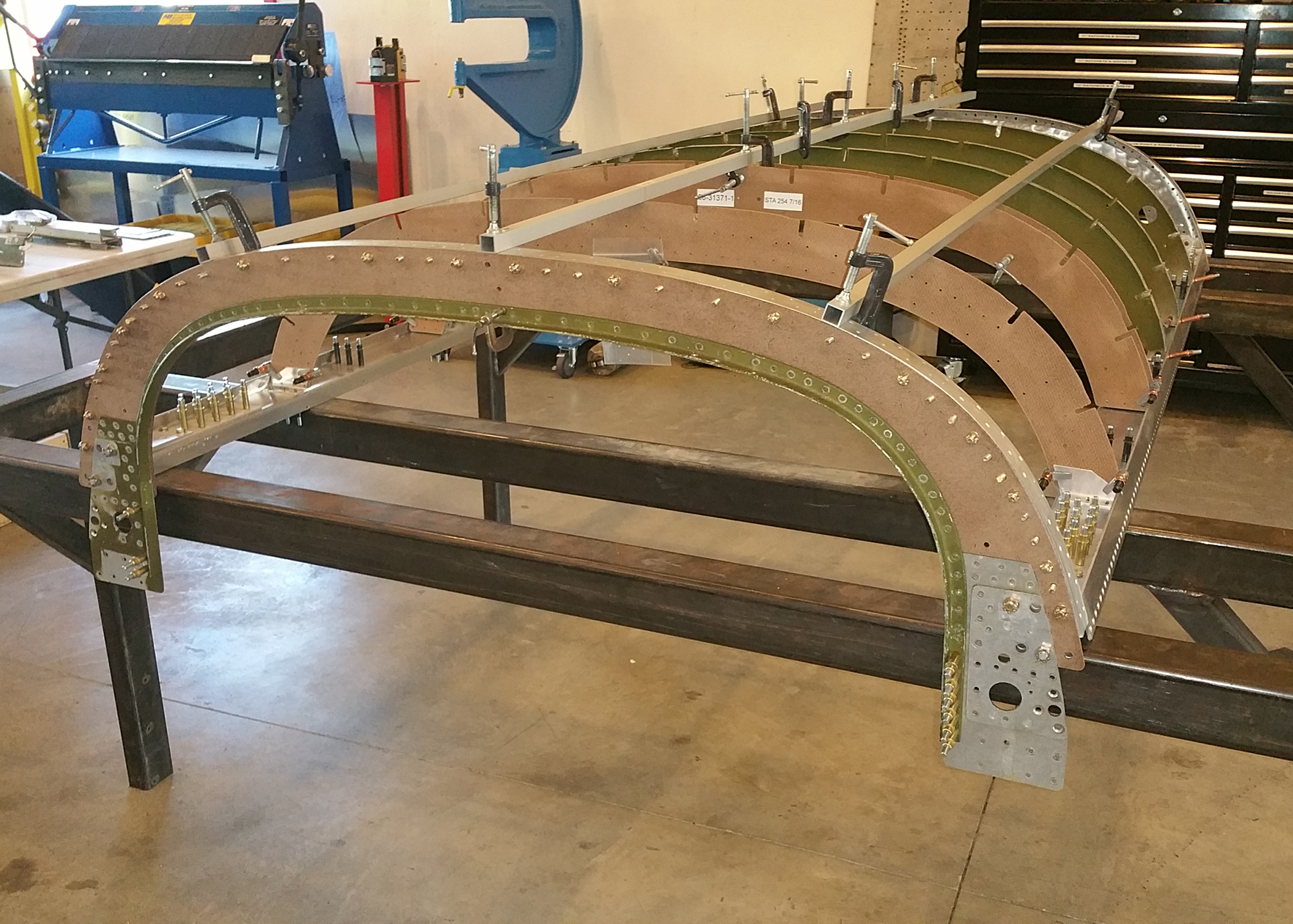 The current status of the Sandbar Mitchell’s bomb bay upper fuselage sub-assembly, showing the original longerons, new attachment angles and templates installed. (photo via Patrick Mihalek)