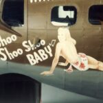 Also, the original name “Shoo Shoo Baby” was simply ornate lettering, no nose art. When Tony Starcer painted the Varga girl on the nose he also correctly added an extra “Shoo”.
