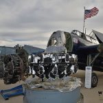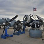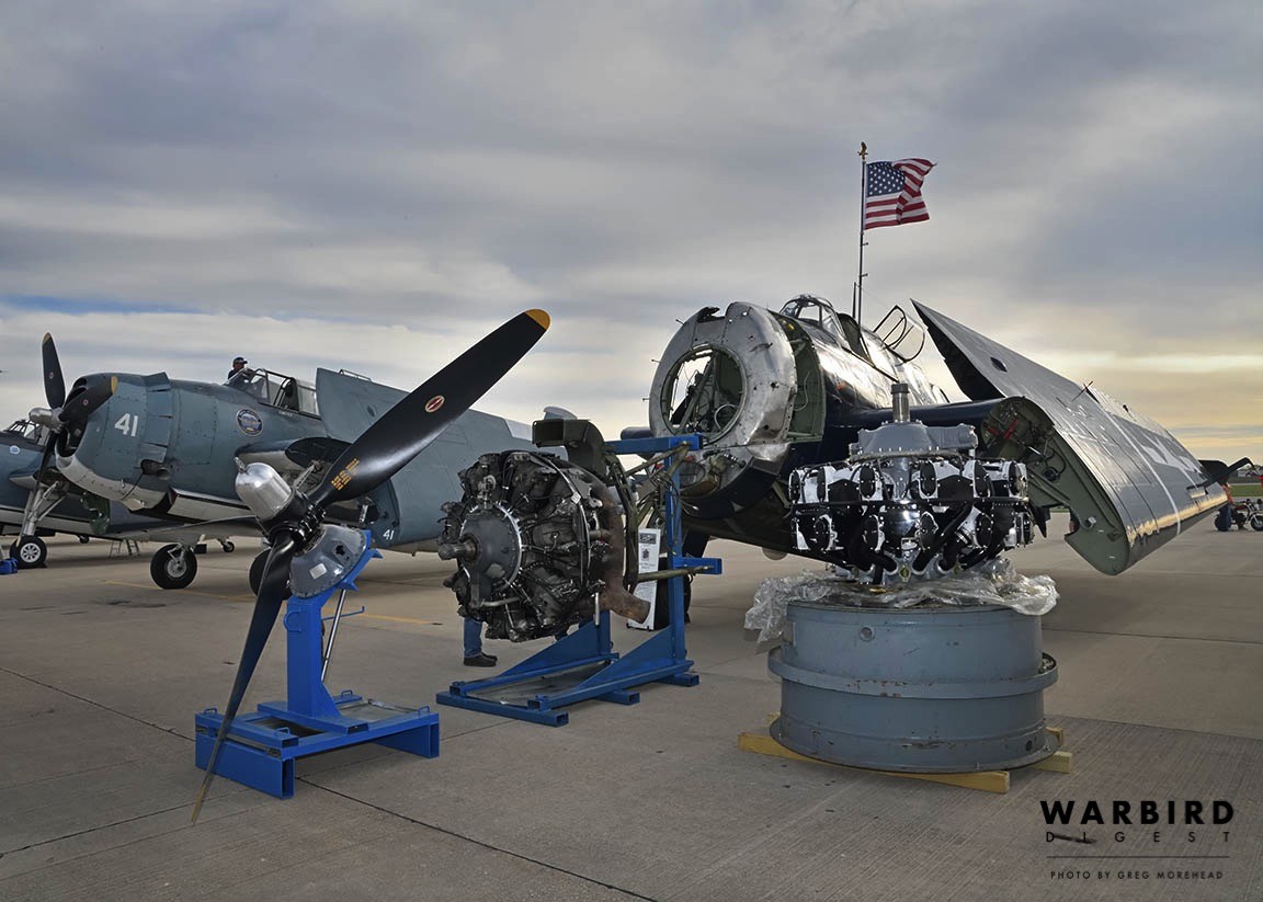 While Friday offered lots of flying for most, the TBM Reunion’s founders, Brad and Jane Deckert, weren’t able to do so this year much to their frustration, because their combat-veteran TBM-3E Avenger (Bu85632) is currently awaiting the installation of a new engine. However, Deckert’s crew had just picked up their freshly-rebuilt Curtiss-Wright R-2600 and took the opportunity to display the airplane on the ramp, with its old engine removed and the replacement unit sitting beside it; spectators marveled at getting a close look at the big round engines, which are normally hidden from view eight feet up in the air and mainly covered with cowlings.