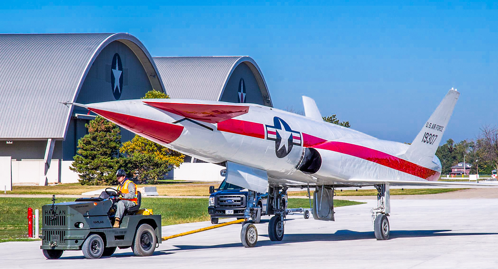 Restoration staff move the Republic XF-91 Thunderceptor into the new fourth building at the National Museum of the U.S. Air Force on Oct. 8, 2015. (U.S. Air Force photo by Ken LaRock)