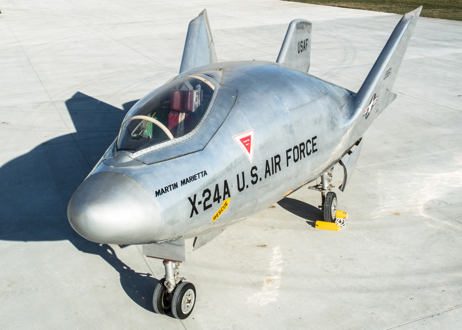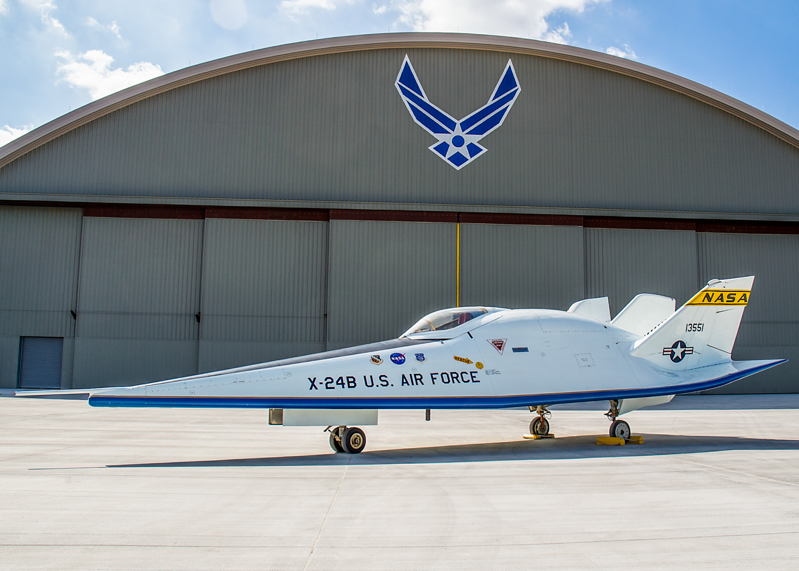 The Martin X-24B in front of the new fourth building at the National Museum of the U.S. Air Force on Oct. 14, 2015. The X-24B started life as the radically different X-24A as represented in the image above. (U.S. Air Force photo by Ken LaRock)