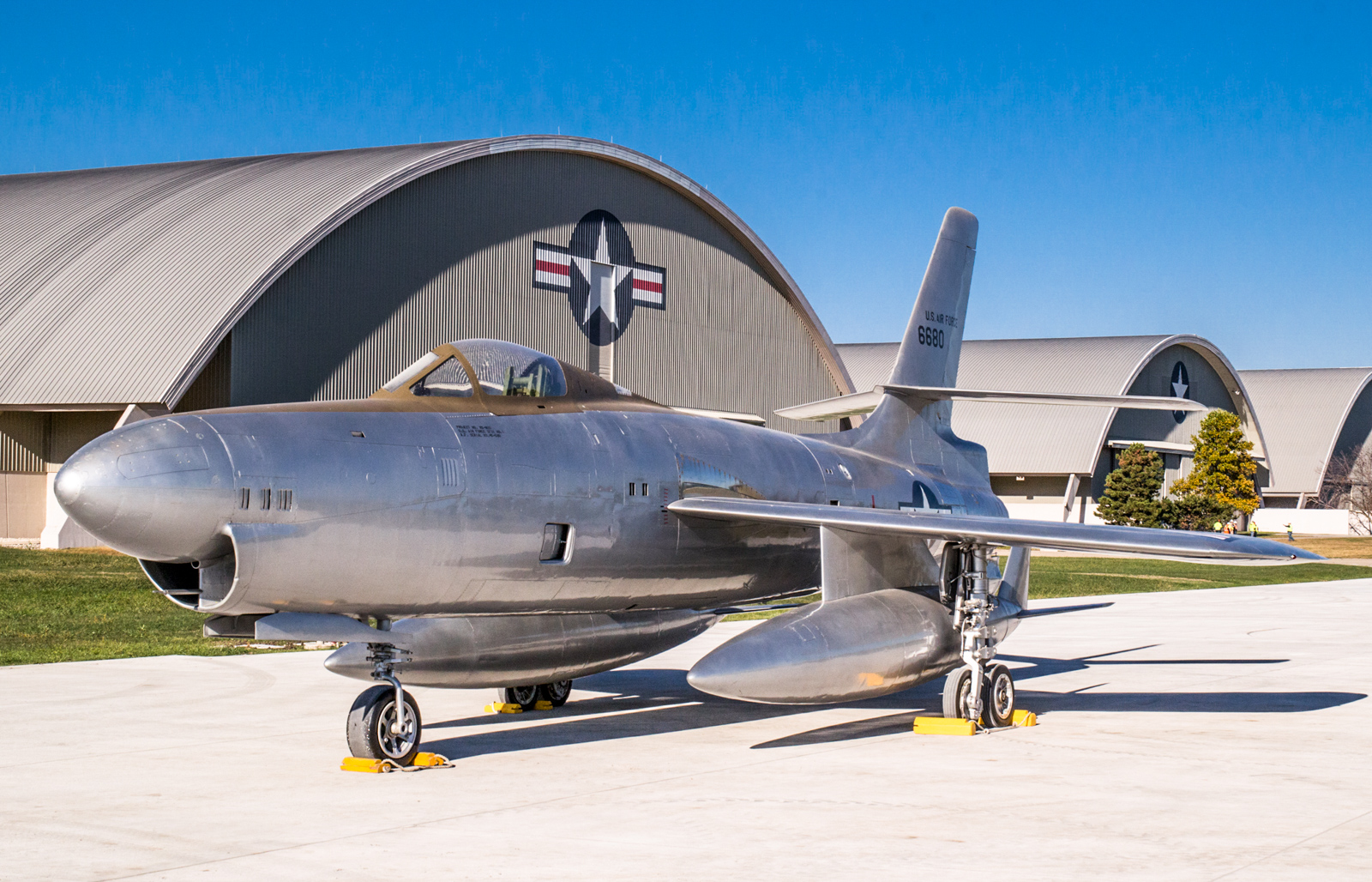 A great view of the Republic XF-91 Thunderceptor in front of its new home. This image shows the inverse taper of its wings to great effect. The aircraft had mixed propulsion system which included its normal jet engine, assisted by four rocket engines for boosting its climb rate for bomber interception. (U.S. Air Force photo by Ken LaRock)
