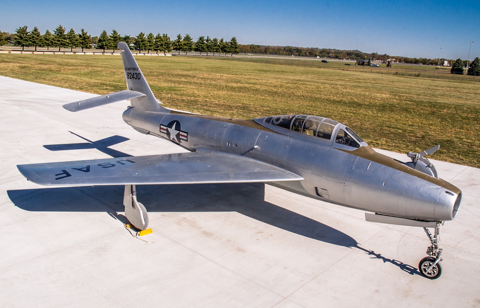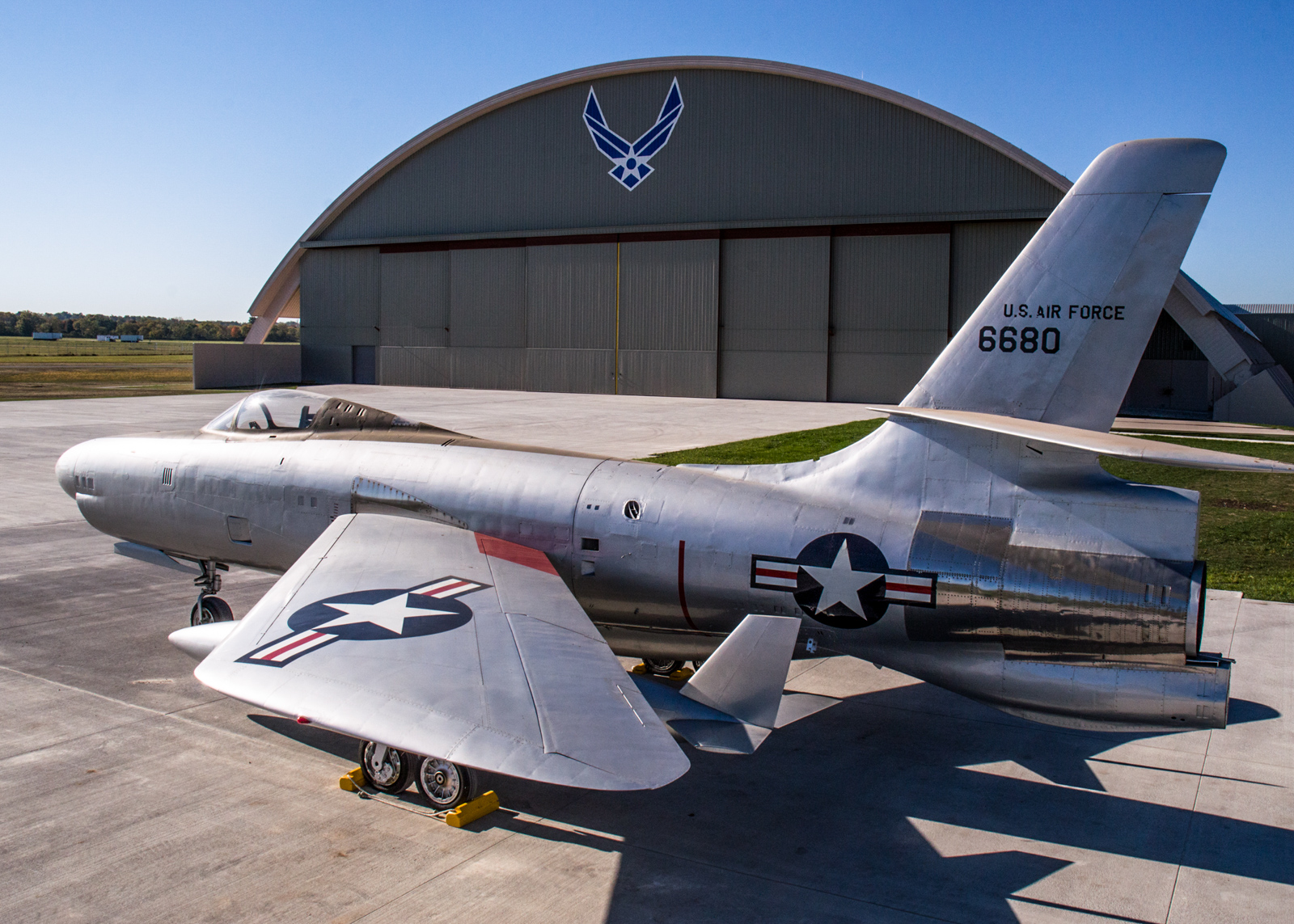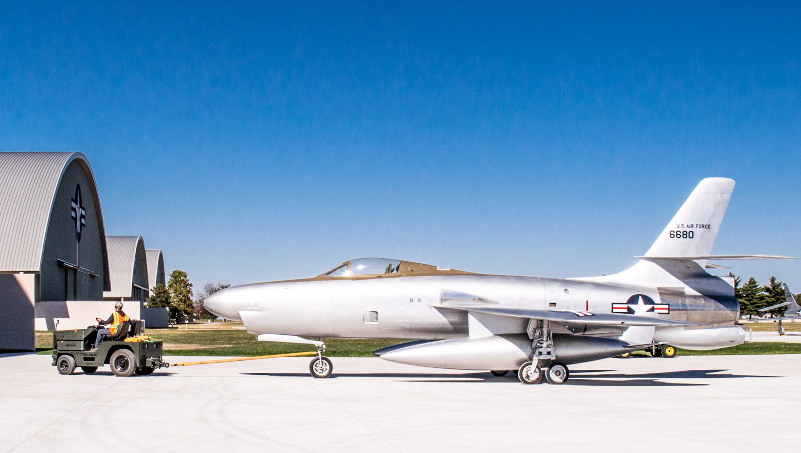 The Republic YRF-84F about to enter its new home at the National Museum of the U.S. Air Force. The aircraft was a highly modified version of the RF-84F Thunderflash, itself a variant of the F-84 Thunderjet fighter. (U.S. Air Force photo by Ken LaRock)