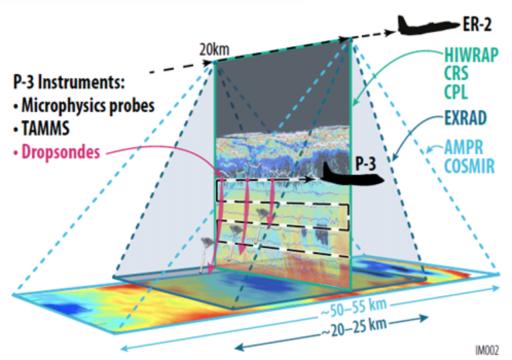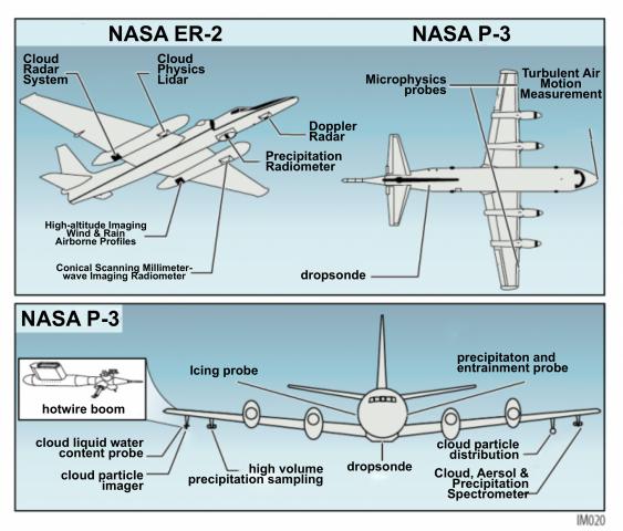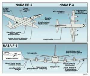 The ER-2 often partners with a NASA P-3 Orion when studying weather systems. During such operations, the ER-2 will operate its advanced radar, lidar, and microwave radiometer remote sensing instruments, while the P-3 collects data from its sensors to measure the water content and particle size in clouds, icing and the airflow around a precipitation event. The P-3 can also deploy radiosondes similar to those used to study hurricanes.