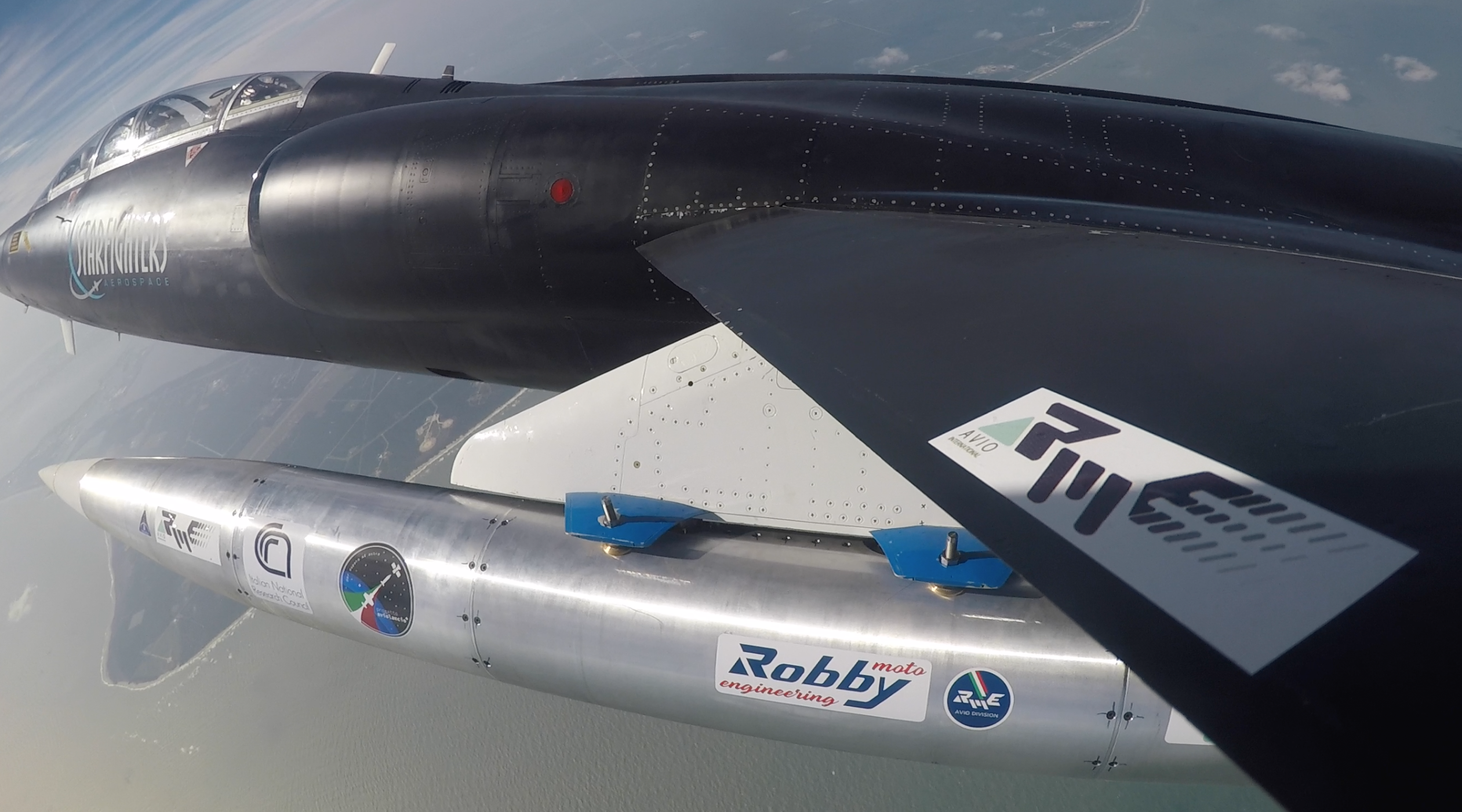 Non-operational flight testing for the new rocket has already begun at Cape Canaveral. In late November, Starfighters Aerospace slung the first full-scale, sensor-laden (albeit motor-less) prototype from a hard point under the port wing of TF-104G-M (MM54258/N991SA) and took it aloft. With Piercarlo Ciacchi at the controls, CNR’s technical manager for the project, sat in the TF-104’s rear seat as an observer. Starfighter Aerospace’s president, Rick Svetkoff, flew chase in another of his company’s TF-104s during the test, with another Project Manager for the entire CNR program, in the back of his aircraft. The sortie lasted about fifty minutes and involved a physical evaluation of the test article’s mechanical integrity, aerodynamic properties and suitability for launch from the Starfighter platform. Telemetry data from the test article’s sensors, recorded remotely, gave the development team valuable data regarding the temperatures, pressure, mechanical loading and aerodynamic forces which the rocket will experience prior to launch; this will hopefully ensure that the design is fully ready for the first operational test which CNR hopes to conduct next year.