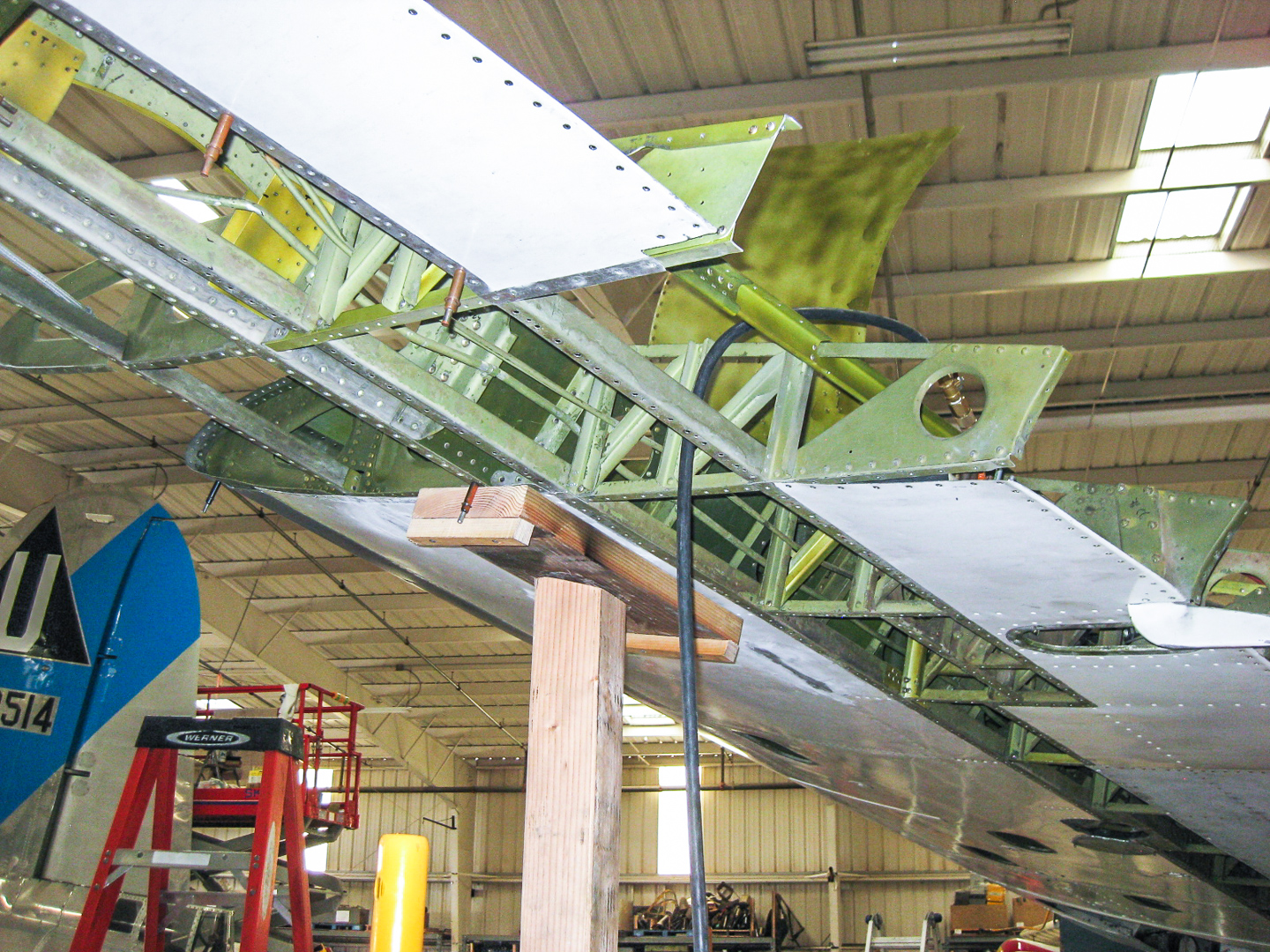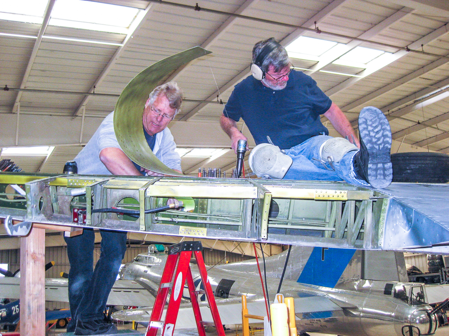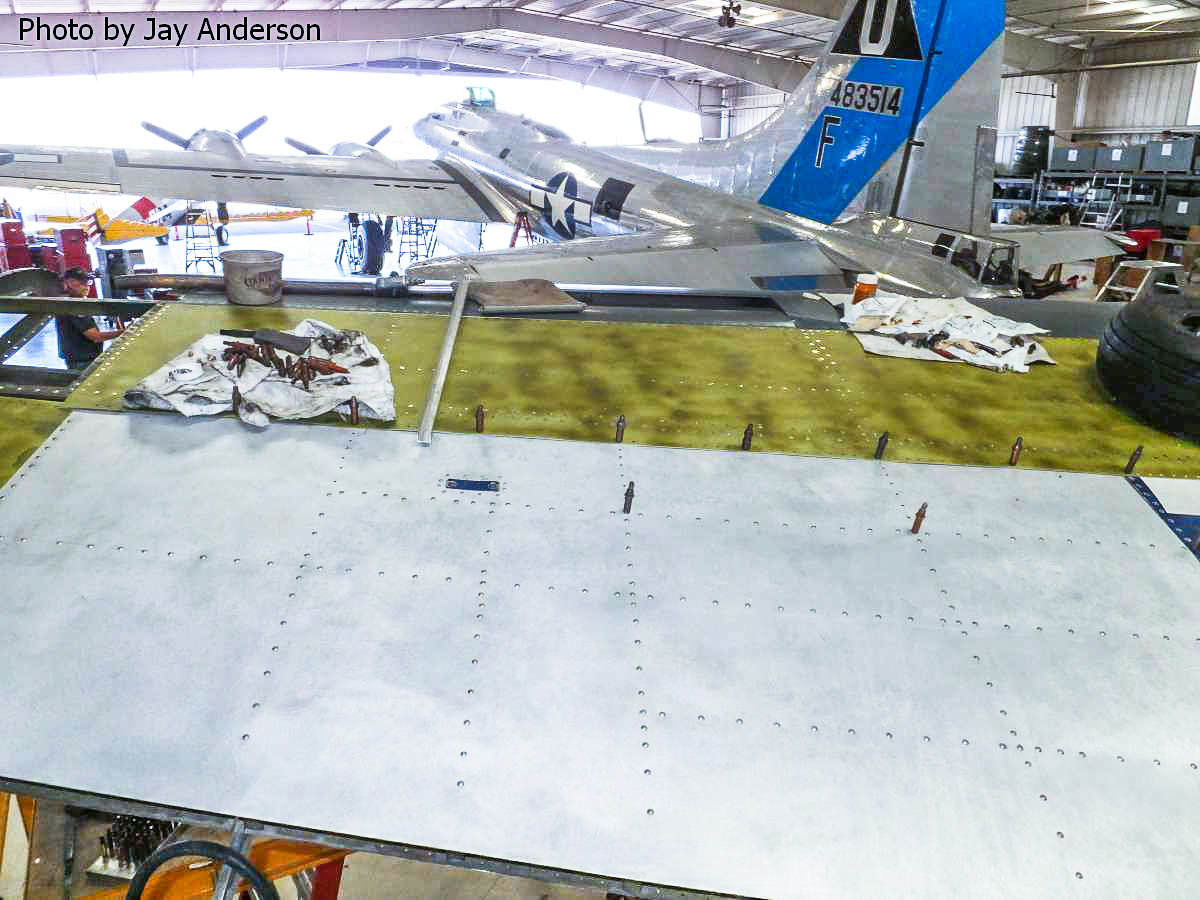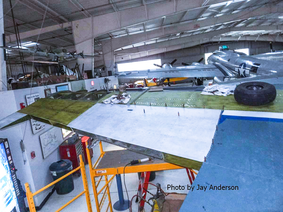 The Rocky Mountain Wing’s Maintenance Officer reports the following… “Paying for full time effort has achieved the desired effect, giving the TBM repair project a real boost in progress. The year began with the wing supported by scaffolding as the skins were removed for internal repairs. These internal repairs are now completed by Grant and Kevin. Enough of the upper and lower skins have been replaced to provide the structural integrity that the scaffolds have been removed. The leading edge requires special tooling which will be done by a local company which has donated other similar efforts. The front cowlings and accessory deck are the next to be completed before the overhauled engine and new propeller can be mounted. We will take this opportunity to install new hoses and wiring harnesses for the engine compartment. Lower fuselage and bomb bay doors also require some sheet metal work. A call will be made for RMW volunteers to help out when it can be done – perhaps within a month. Things are looking more hopeful for the 2015 airshow season.”