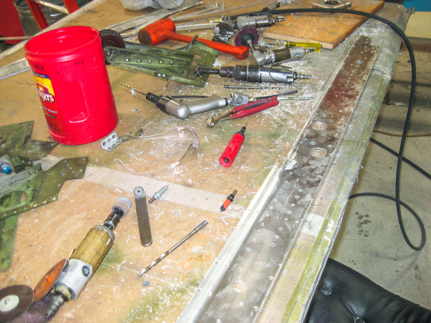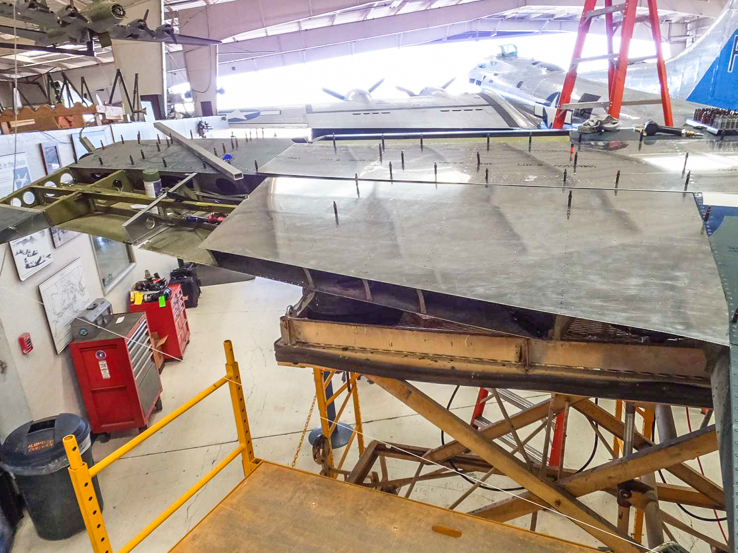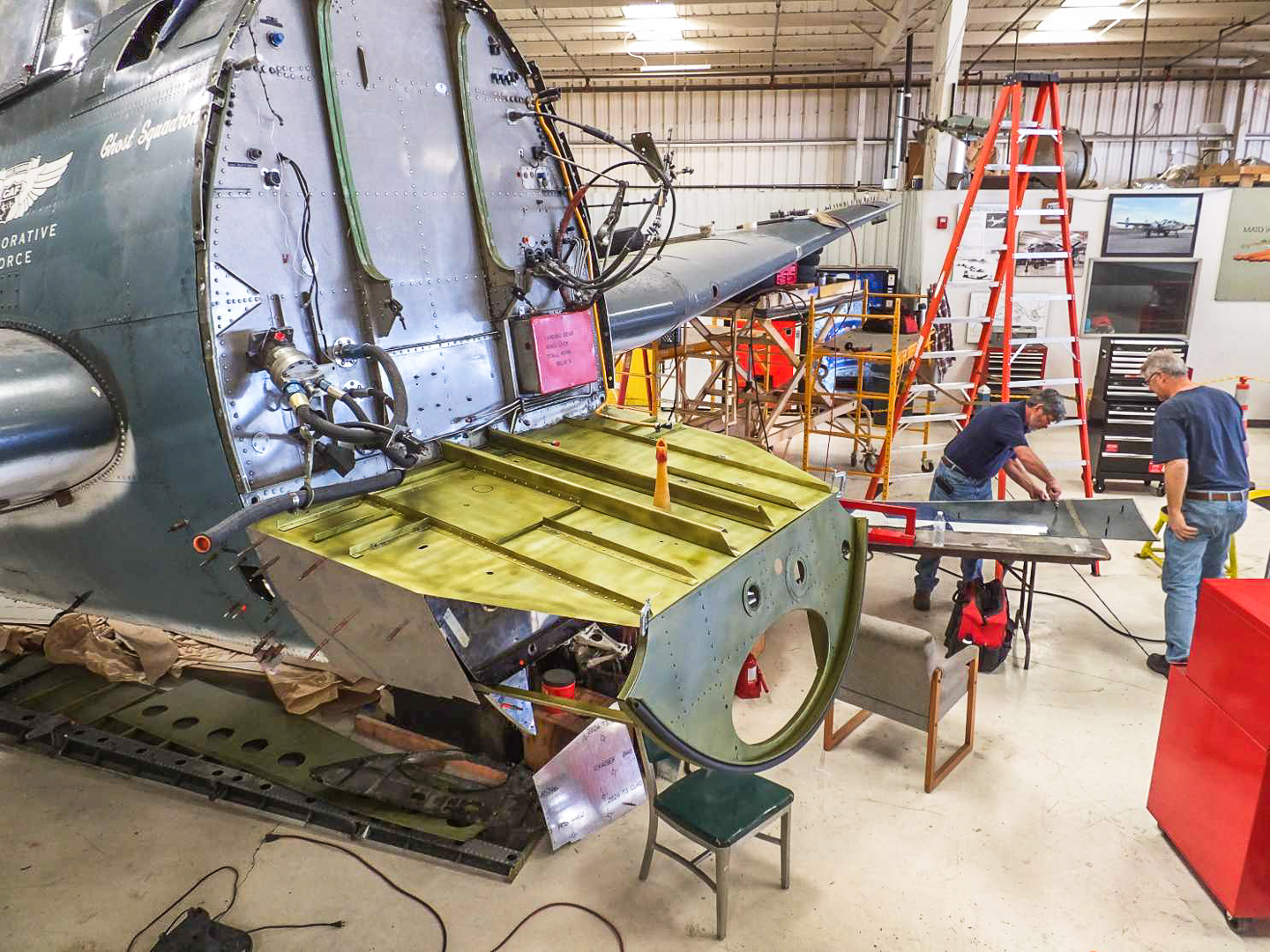 The Rocky Mountain Wing’s Maintenance Officer reports the following… “Paying for full time effort has achieved the desired effect, giving the TBM repair project a real boost in progress. The year began with the wing supported by scaffolding as the skins were removed for internal repairs. These internal repairs are now completed by Grant and Kevin. Enough of the upper and lower skins have been replaced to provide the structural integrity that the scaffolds have been removed. The leading edge requires special tooling which will be done by a local company which has donated other similar efforts. The front cowlings and accessory deck are the next to be completed before the overhauled engine and new propeller can be mounted. We will take this opportunity to install new hoses and wiring harnesses for the engine compartment. Lower fuselage and bomb bay doors also require some sheet metal work. A call will be made for RMW volunteers to help out when it can be done – perhaps within a month. Things are looking more hopeful for the 2015 airshow season.”