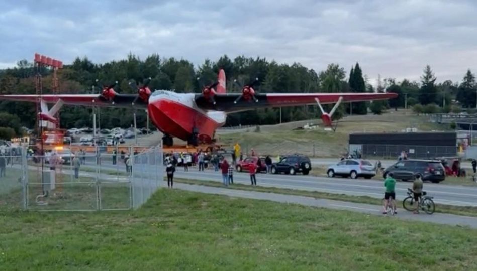 On the evening of Wednesday, August 21, 2024, just after 9:00 pm, the Hawaii Mars water bomber made its way to the British Columbia Aviation Museum under a picturesque sunset of pink and grey clouds. Delivered by Nickel Brothers Moving’s special transportation service, the aircraft was expertly maneuvered onto the museum grounds without a single scratch. The Mars was suspended seven feet above the ground on a 360-degree rotating trailer as it crept across the active taxiways of Victoria Airport, reminiscent of the Space Shuttle’s iconic moves—an incredible sight for onlookers on the ground and passengers on arriving flights alike.