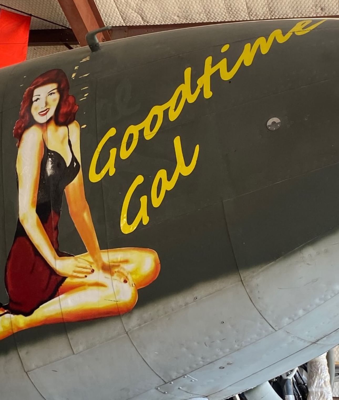 When the CAF received the Lodestar, it had no nose art. Volunteers painted it in classic Army green and soon after added a pin-up nose art featuring a blonde woman and the aircraft’s name. In the 2010s, “Goodtime Gal” received a new paint job and updated nose art inspired by Rita Hayworth in the film Gilda.