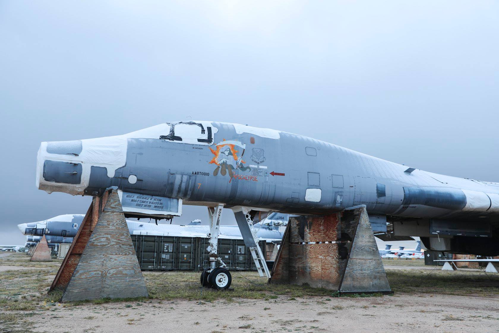 A North American Rockwell B-1B Lancer bomber sitting stripped and rather forlorn in a row of other retired ‘Bones’ at AMARG. The dusting of snow is quite evident on her upper fuselage behind the cockpit. This example is 85-0092, which last served with the 128th BS/116th BW in the Georgia Air National Guard at Robins AFB in Warner Robins, Georgia. Nicknamed ‘Apocalypse’ this particular airframe was retired to AMARG (then known as AMARC) in late 2002 when the US Air Force drew down their B-1 fleet from 92 to 60 examples. Like many of the other B-1s at AMARG, this bomber has sacrificed a lot of its components to allow the active fleet to keep flying. (photo via 309th AMARG)