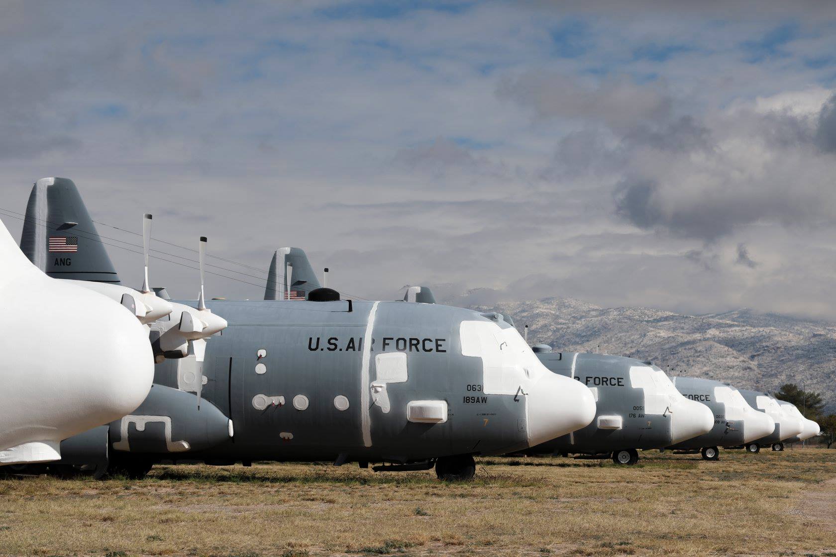 A line of C-130 Hercules sit in the desert sun with snow-dusted mountains in the distance. The first Hercules in the line up is C-130H 81-0631 which last served with the 189th Airlift Wing at Little Rock AFB in Arkansas. She arrived in September, 2017. Behind this Herc’ is C-130H 82-0059 which also arrived in September 2017 after last serving with the 176th AW at Kulis Camp in Anchorage, Alaska. And finally, behind this airframe is another September 2017 arrival, C-130H 85-0035 which last flew with the 109th AW of the New York Air Guard.
