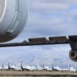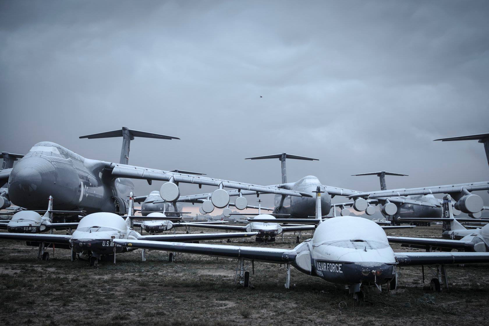 A view of the snow covered mountains seen from under the wing of a C-5 Galaxy. Several rows of T-37s are visible in the distance. (photo via 309th AMARG)