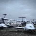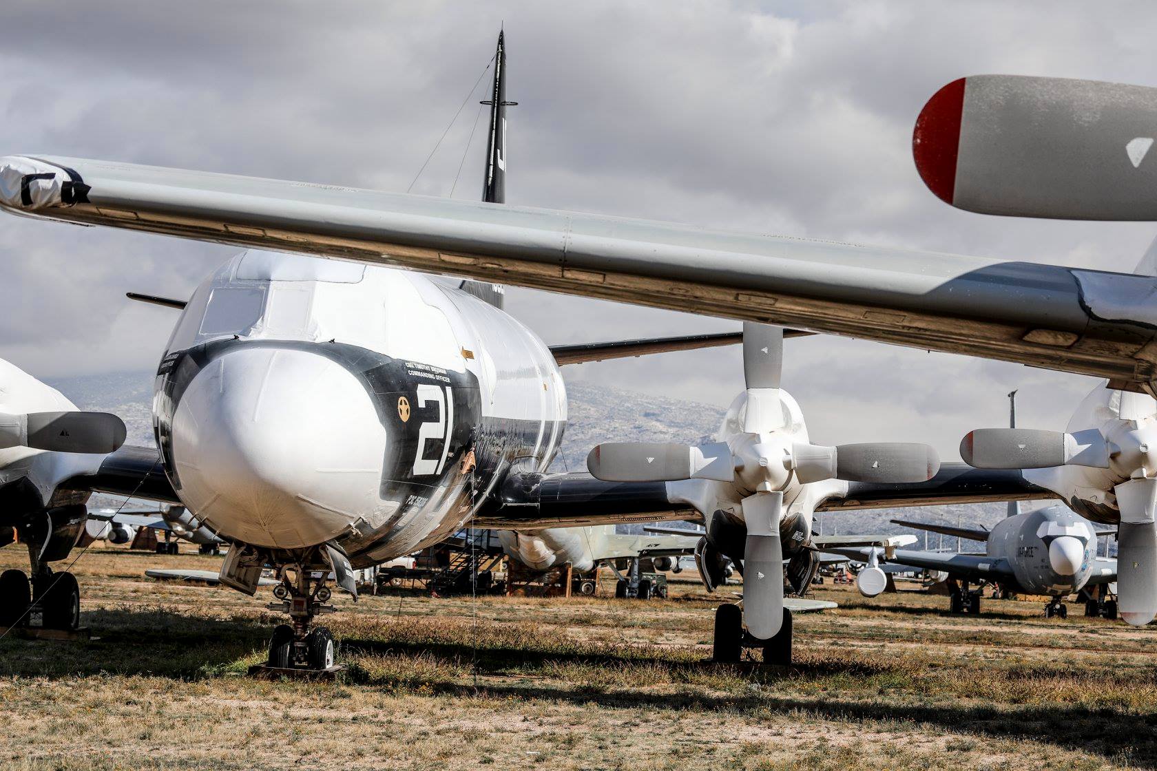 There are more than a hundred and fifty Lockheed P-3 Orions on the books with the 309th AMARG. The example in the foreground is P-3C Bu.158206 which wears a retro white-over-black paint scheme from her time serving as the assigned aircraft for Commander, Patrol Reconnaissance Wing 10 (CPRW-10) at NAS Whidbey Island. She received this 1960s era paint scheme as part of the celebrations for the Centenary of Naval Aviation in 2011. She arrived for storage at AMARG in 2013. (photo via 309th AMARG)