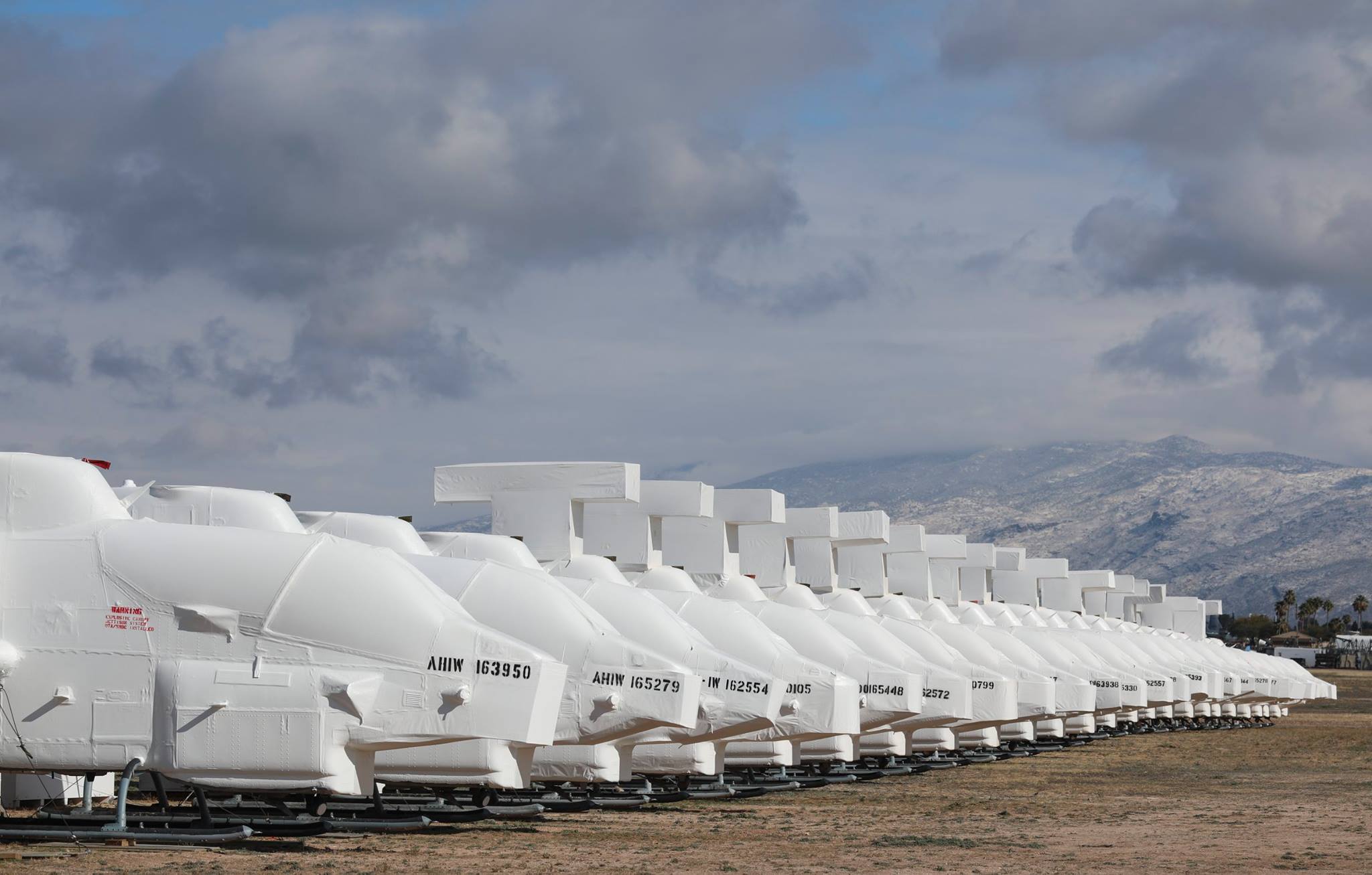 A lineup of well-preserved former US Marine Corps Bell AH-1W SuperCobras, including Bureau Numbers 163950, 165279, 162554, 160105, 165448, 162572,160799, 163938, 165330, 162557, 165393 and 165278. These are all relatively recent arrivals from 2018, but may well be refurbished in the near future for overseas sales. (photo via 309th AMARG)