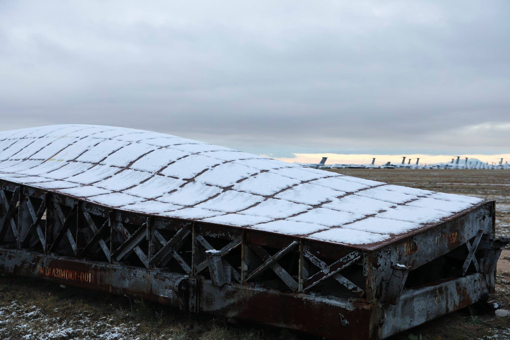 While this unusual, snow-covered object at AMARG is actually one of the fabrication jigs used to form the fuselage on the Northrop B-2 Spirit bomber production line. It is not unusual for AMARG to store the jigs and even the tooling from aircraft production lines once they run dormant, just in case the lines need to re-open again. This was the case for the B-2, whose production ended after just 21 airframes (of the originally planned 132 examples) had been completed. (photo via 309th AMARG)